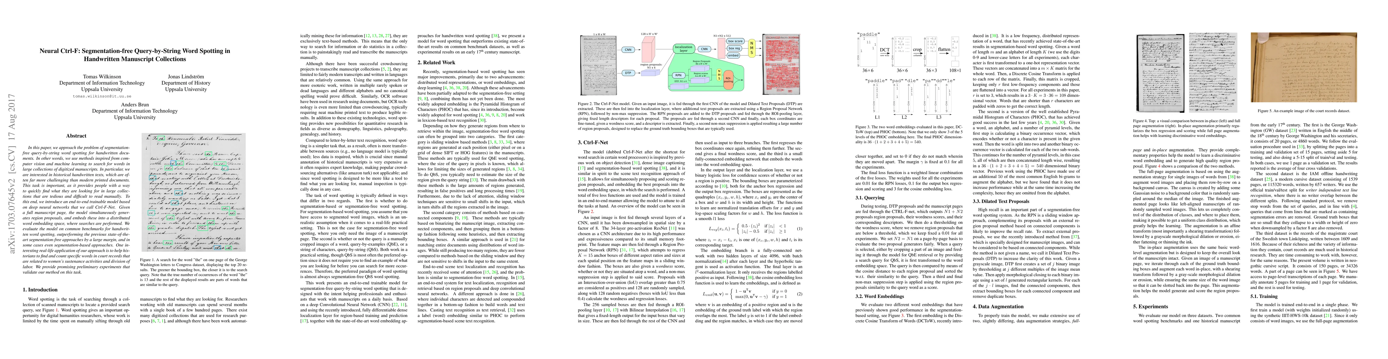 This paper introduces Ctrl-F-Net, a deep neural network model for segmentation-free query-by-string word spotting in handwritten manuscripts, outperforming existing methods on benchmarks. It aims to facilitate historians in efficiently searching large collections of historical documents.