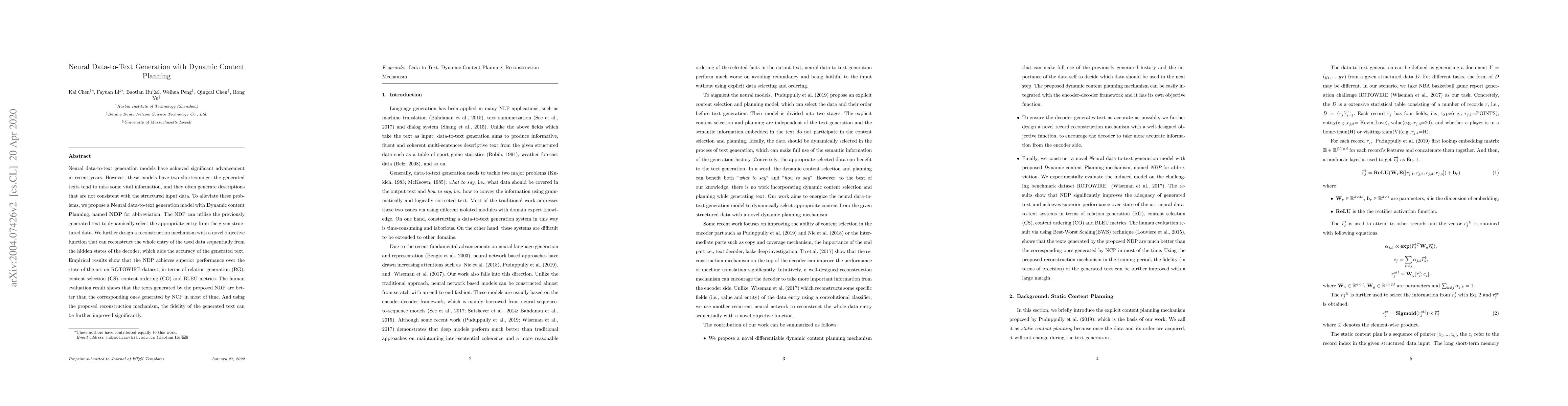 The paper proposes NDP, a Neural data-to-text generation model with Dynamic content Planning, to address shortcomings in existing models by dynamically selecting vital information and ensuring consistency with structured data inputs. Empirical results show NDP outperforms state-of-the-art models on various metrics, and human evaluations indicate improved text fidelity.