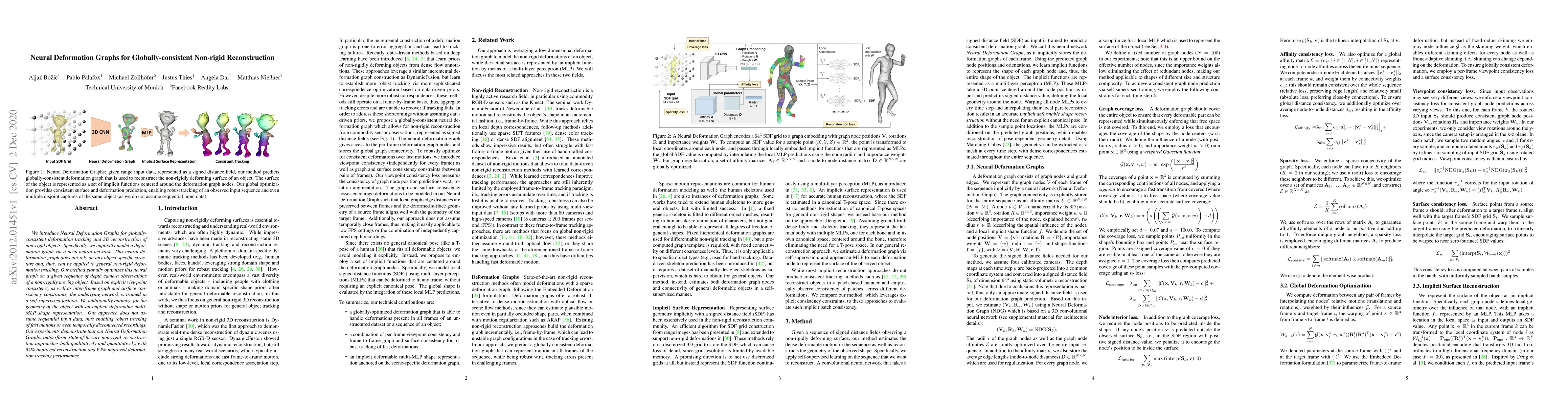 This paper proposes Neural Deformation Graphs for globally-consistent 3D reconstruction of non-rigid objects, using a deep neural network to implicitly model deformation without object-specific structures. The method achieves superior performance in reconstruction and deformation tracking compared to state-of-the-art techniques.