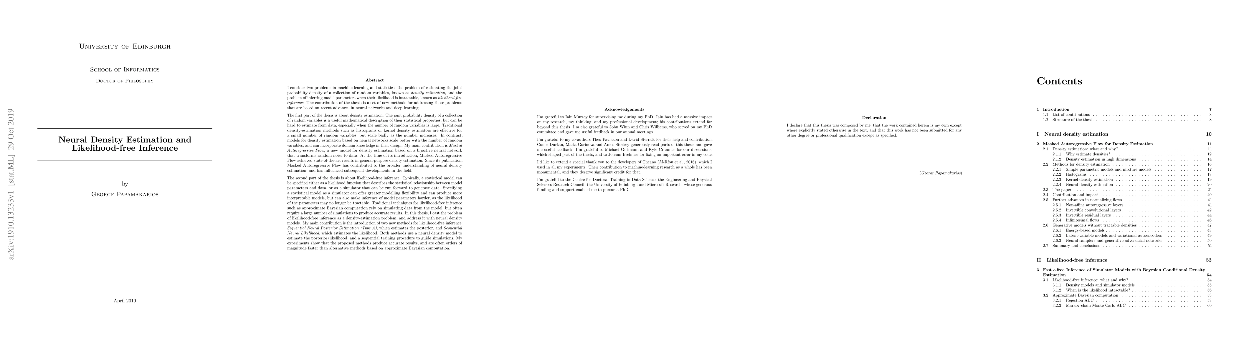 This paper introduces novel neural network-based methods for density estimation and likelihood-free inference, leveraging recent advances in deep learning to tackle the challenges of estimating joint probability distributions and inferring model parameters without requiring tractable likelihood functions.