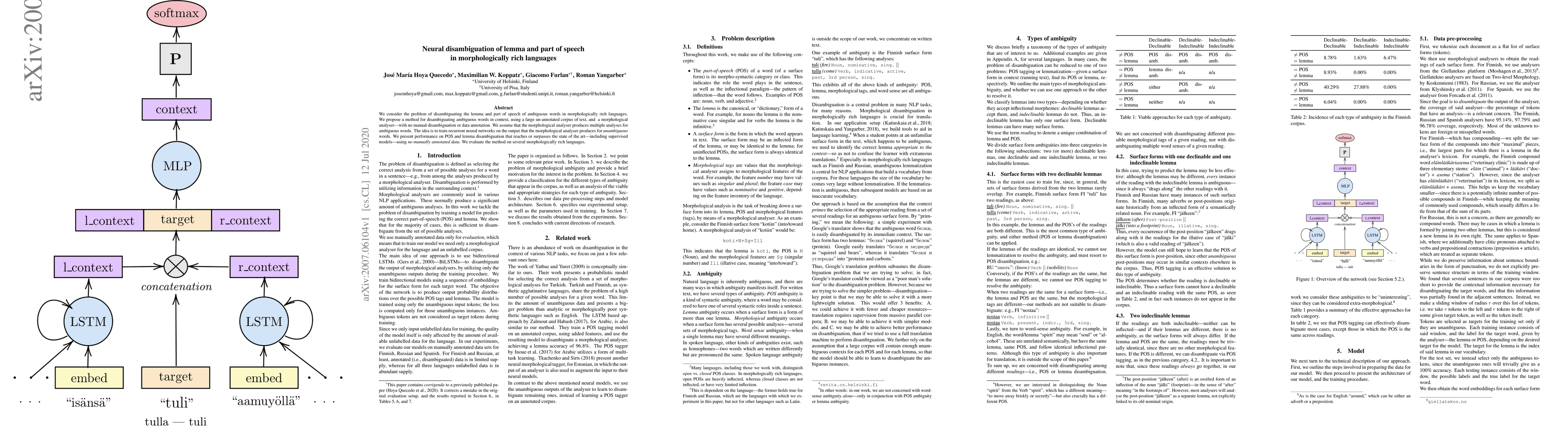 This paper proposes a neural method for disambiguating lemma and part of speech in morphologically rich languages using a large un-annotated corpus and a morphological analyser, achieving state-of-the-art performance without manual data annotation. The approach trains recurrent neural networks on the analyser's output for unambiguous words.