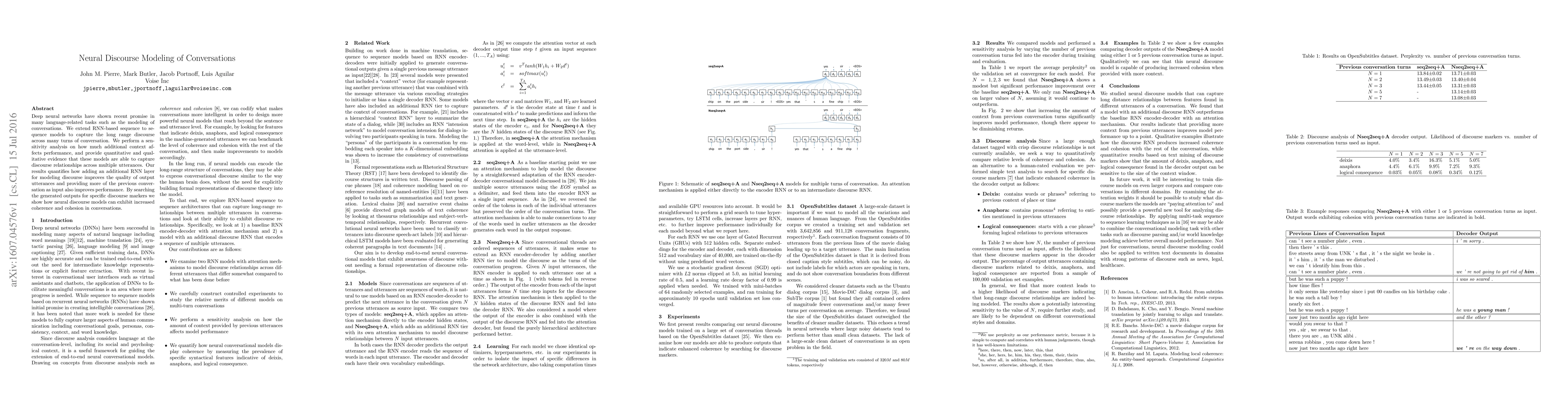 This paper explores the use of RNN-based sequence-to-sequence models to capture long-range discourse in conversations, demonstrating that additional context and an extra RNN layer improve coherence and cohesion. The study provides quantitative and qualitative evidence of enhanced performance through sensitivity analysis.