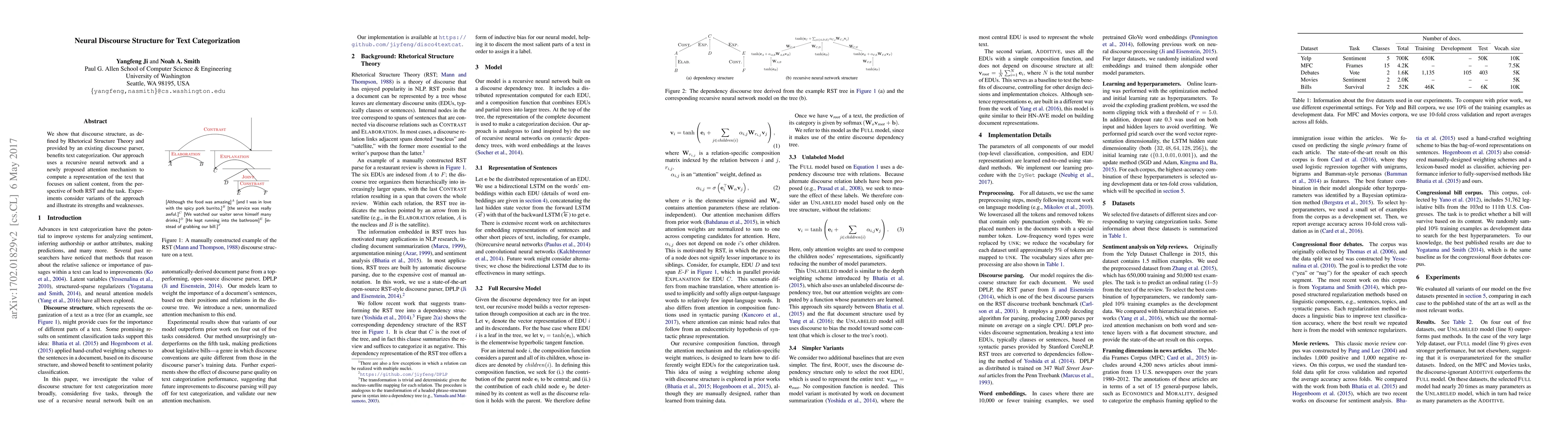 Researchers found that using discourse structure in text categorization improves accuracy using a recursive neural network with an attention mechanism. This approach focuses on salient content from both the discourse structure and task perspective.