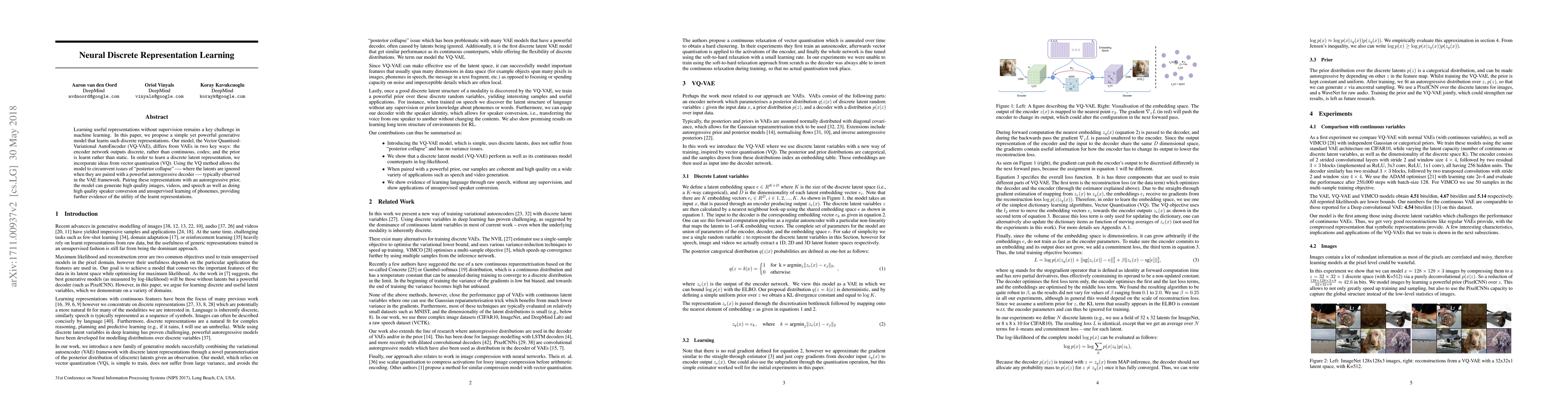 This paper introduces the Vector Quantised-Variational AutoEncoder (VQ-VAE), a generative model that learns discrete representations without supervision. Unlike traditional VAEs, VQ-VAE uses vector quantisation to produce discrete, rather than continuous, codes, which helps avoid "posterior collapse" and enables high-quality generation of images, videos, and speech.