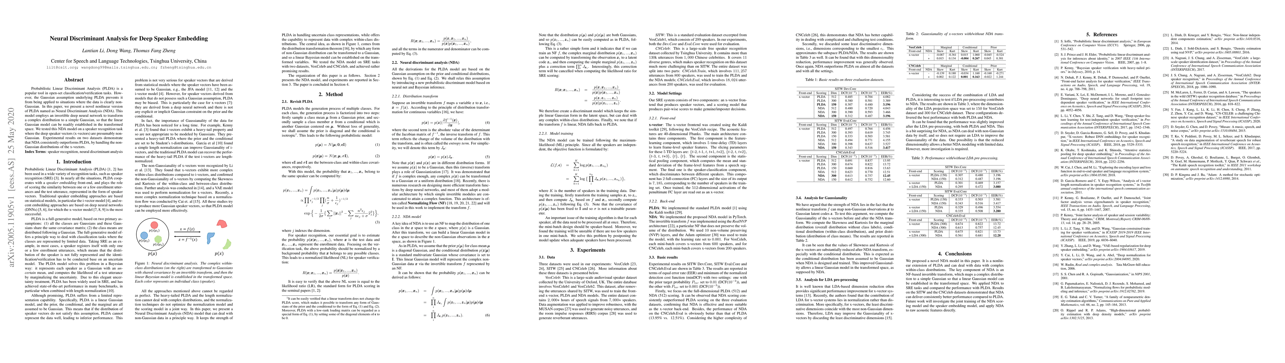 The paper introduces Neural Discriminant Analysis (NDA), a nonlinear extension of Probabilistic Linear Discriminant Analysis (PLDA), which uses a deep neural network to transform non-Gaussian distributions into Gaussian ones, improving performance in speaker recognition tasks. NDA outperforms traditional PLDA on datasets with non-Gaussian x-vectors.