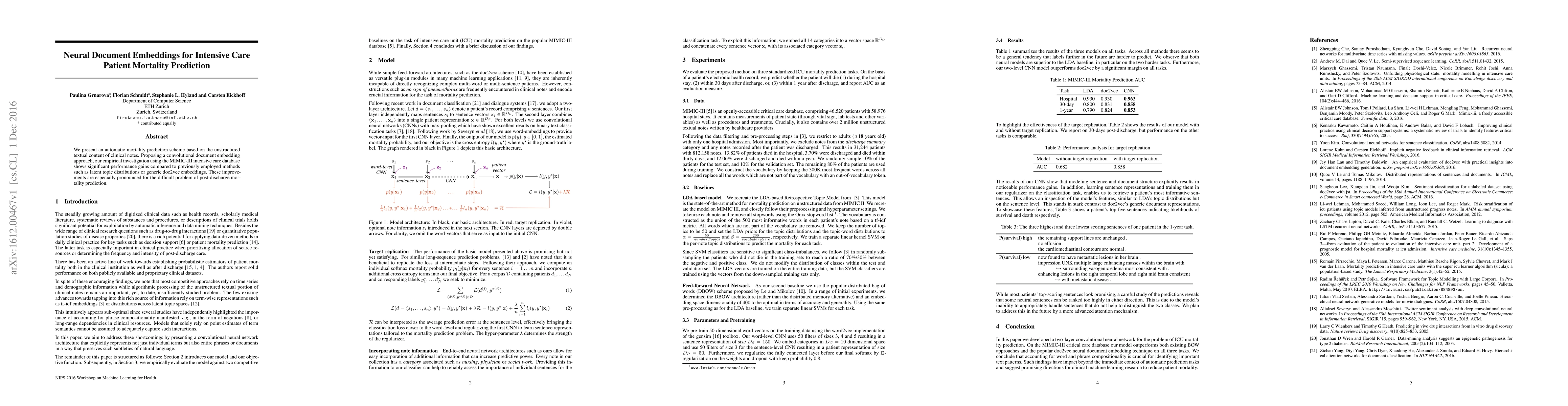 This paper introduces a novel convolutional neural network for embedding clinical notes to predict patient mortality, demonstrating significant improvements over traditional methods using the MIMIC-III database, particularly for post-discharge mortality prediction. The proposed method outperforms latent topic and generic doc2vec embeddings.