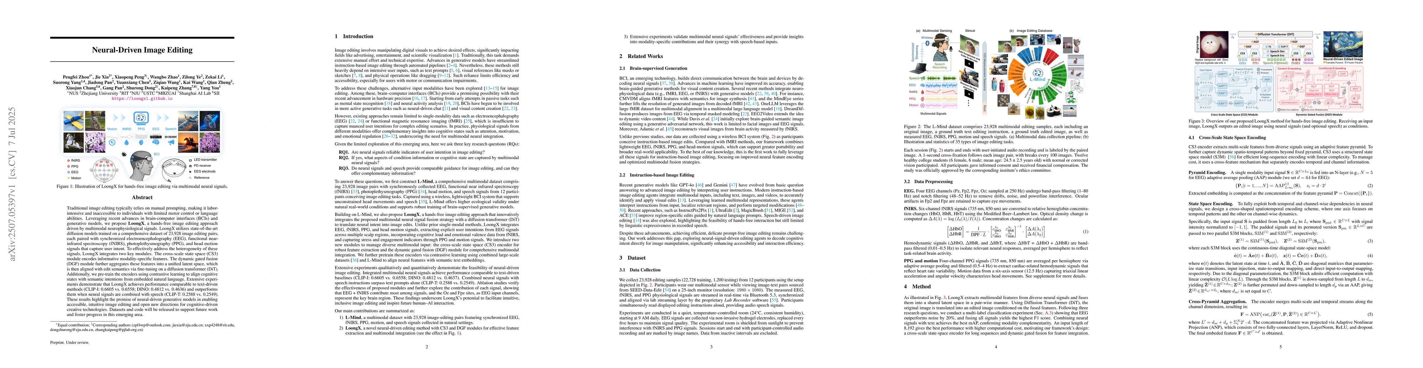 Traditional image editing typically relies on manual prompting, making it labor-intensive and inaccessible to individuals with limited motor control or language abilities. Leveraging recent advances in brain-computer interfaces (BCIs) and generative models, we propose LoongX, a hands-free image editing approach driven by multimodal neurophysiological signals. LoongX utilizes state-of-the-art diffusion models trained on a comprehensive dataset of 23,928 image editing pairs, each paired with synchronized electroencephalography (EEG), functional near-infrared spectroscopy (fNIRS), photoplethysmography (PPG), and head motion signals that capture user intent. To effectively address the heterogeneity of these signals, LoongX integrates two key modules. The cross-scale state space (CS3) module encodes informative modality-specific features. The dynamic gated fusion (DGF) module further aggregates these features into a unified latent space, which is then aligned with edit semantics via fine-tuning on a diffusion transformer (DiT). Additionally, we pre-train the encoders using contrastive learning to align cognitive states with semantic intentions from embedded natural language. Extensive experiments demonstrate that LoongX achieves performance comparable to text-driven methods (CLIP-I: 0.6605 vs. 0.6558; DINO: 0.4812 vs. 0.4636) and outperforms them when neural signals are combined with speech (CLIP-T: 0.2588 vs. 0.2549). These results highlight the promise of neural-driven generative models in enabling accessible, intuitive image editing and open new directions for cognitive-driven creative technologies. Datasets and code will be released to support future work and foster progress in this emerging area.