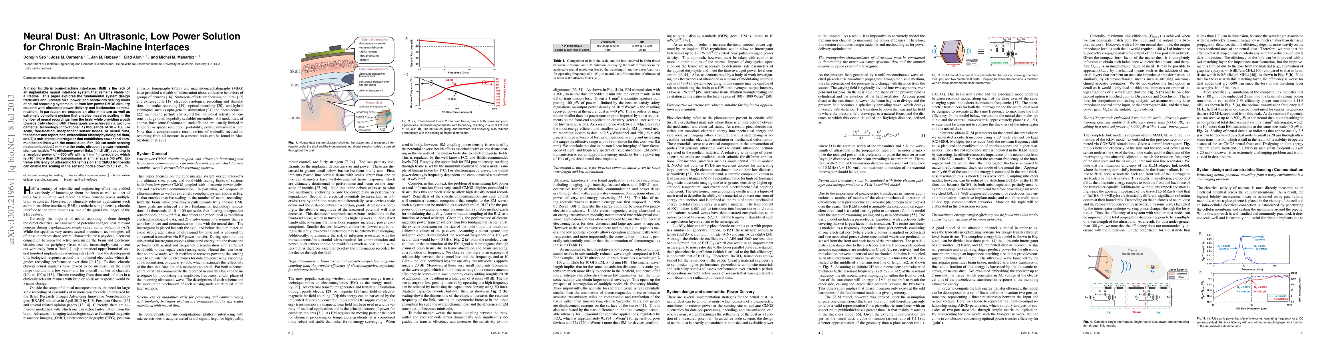 This paper proposes a low-power, ultrasonic solution for chronic brain-machine interfaces using ultra-miniature "neural dust" sensors and a sub-cranial interrogator for power and communication, aiming for massive scalability in neural recordings. The system addresses long-term viability and compliance for chronic BMI applications.