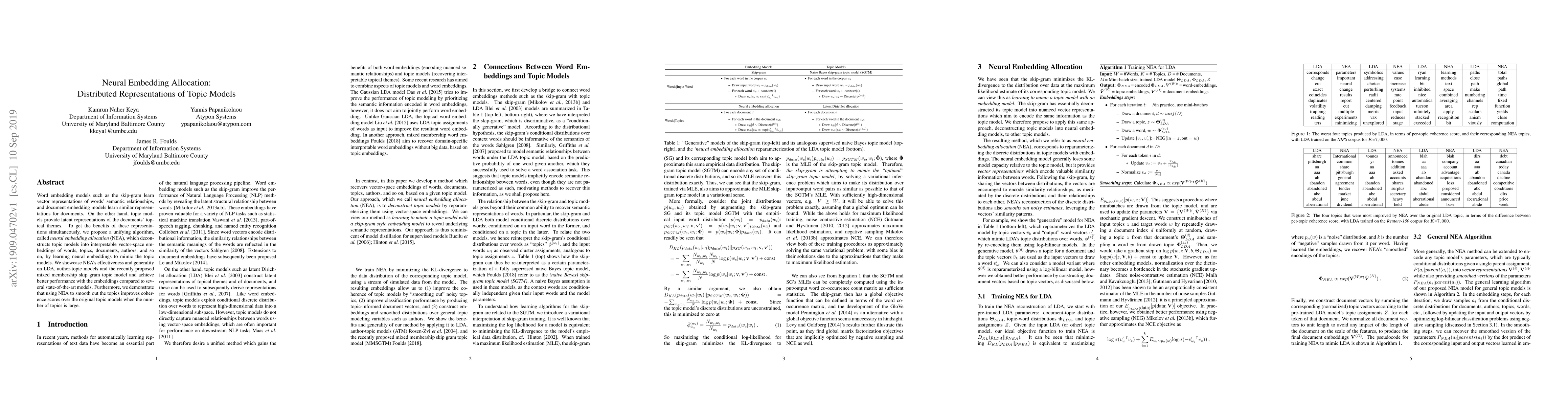 The paper proposes a neural embedding allocation (NEA) algorithm that integrates the benefits of word and document embeddings with those of topic models by learning neural embeddings to mimic topic models. NEA deconstructs topic models into vector-space representations and shows improved performance and coherence over state-of-the-art models.