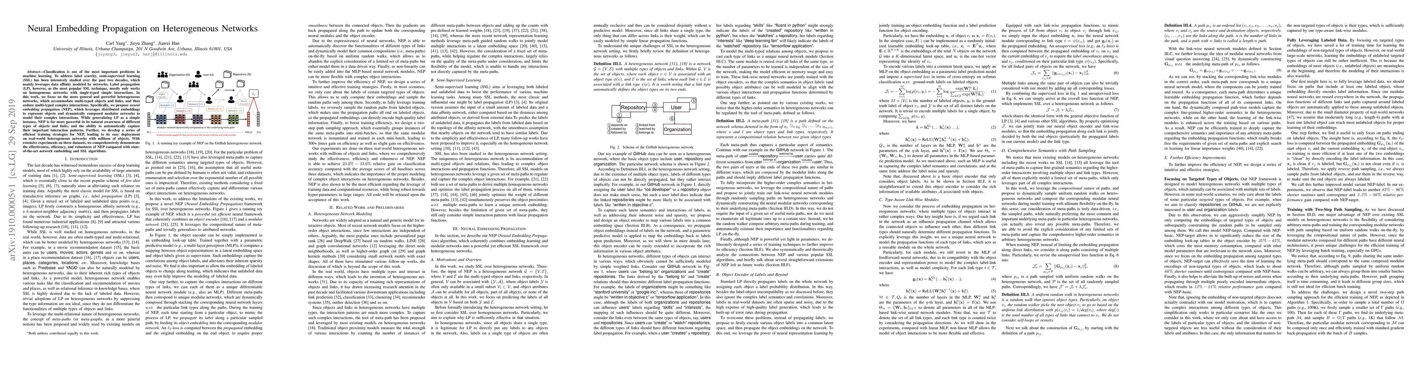 Classification is one of the most important problems in machine learning. To address label scarcity, semi-supervised learning (SSL) has been intensively studied over the past two decades, which mainly leverages data affinity modeled by networks. Label propagation (LP), however, as the most popular SSL technique, mostly only works on homogeneous networks with single-typed simple interactions. In this work, we focus on the more general and powerful heterogeneous networks, which accommodate multi-typed objects and links, and thus endure multi-typed complex interactions. Specifically, we propose \textit{neural embedding propagation} (NEP), which leverages distributed embeddings to represent objects and dynamically composed modular networks to model their complex interactions. While generalizing LP as a simple instance, NEP is far more powerful in its natural awareness of different types of objects and links, and the ability to automatically capture their important interaction patterns. Further, we develop a series of efficient training strategies for NEP, leading to its easy deployment on real-world heterogeneous networks with millions of objects. With extensive experiments on three datasets, we comprehensively demonstrate the effectiveness, efficiency, and robustness of NEP compared with state-of-the-art network embedding and SSL algorithms.