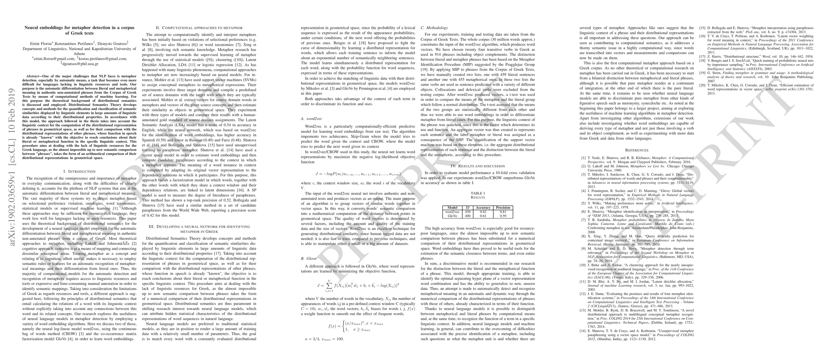 This paper explores the use of neural embeddings and distributional semantics to automatically detect metaphors in Greek texts, addressing the challenge of limited linguistic resources for the language. The research aims to differentiate between literal and metaphorical meanings in authentic, non-annotated phrases from the Corpus of Greek Texts through computational machine learning methods.
