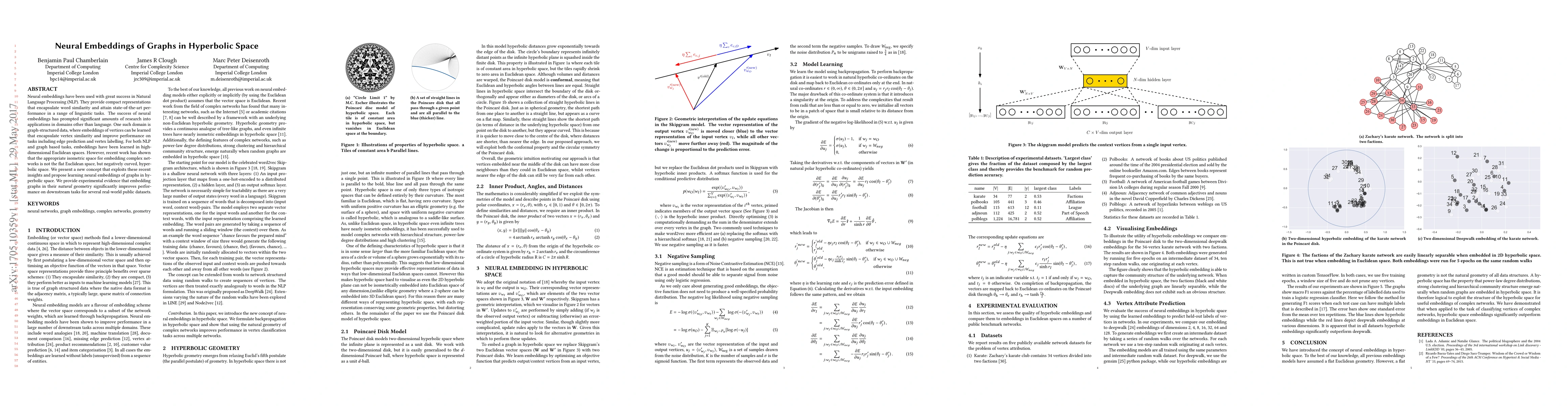 Neural embeddings have been used with great success in Natural Language Processing (NLP). They provide compact representations that encapsulate word similarity and attain state-of-the-art performance in a range of linguistic tasks. The success of neural embeddings has prompted significant amounts of research into applications in domains other than language. One such domain is graph-structured data, where embeddings of vertices can be learned that encapsulate vertex similarity and improve performance on tasks including edge prediction and vertex labelling. For both NLP and graph based tasks, embeddings have been learned in high-dimensional Euclidean spaces. However, recent work has shown that the appropriate isometric space for embedding complex networks is not the flat Euclidean space, but negatively curved, hyperbolic space. We present a new concept that exploits these recent insights and propose learning neural embeddings of graphs in hyperbolic space. We provide experimental evidence that embedding graphs in their natural geometry significantly improves performance on downstream tasks for several real-world public datasets.