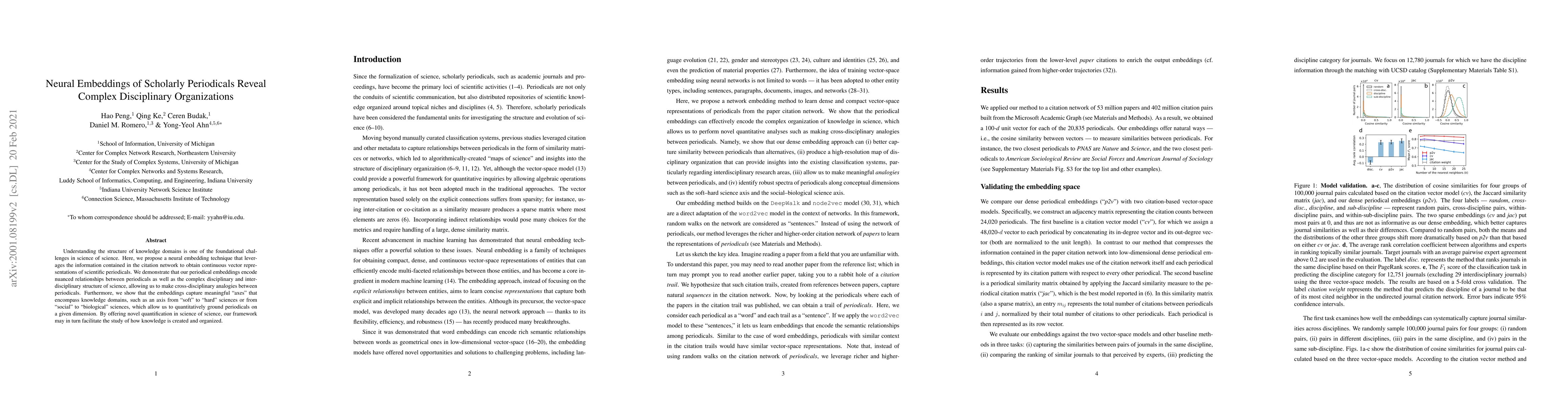 This paper introduces a neural embedding technique to represent scientific periodicals in a continuous vector space, revealing intricate disciplinary and interdisciplinary relationships. The embeddings capture meaningful axes of knowledge domains, enabling quantitative analysis of how knowledge is structured and organized across disciplines.