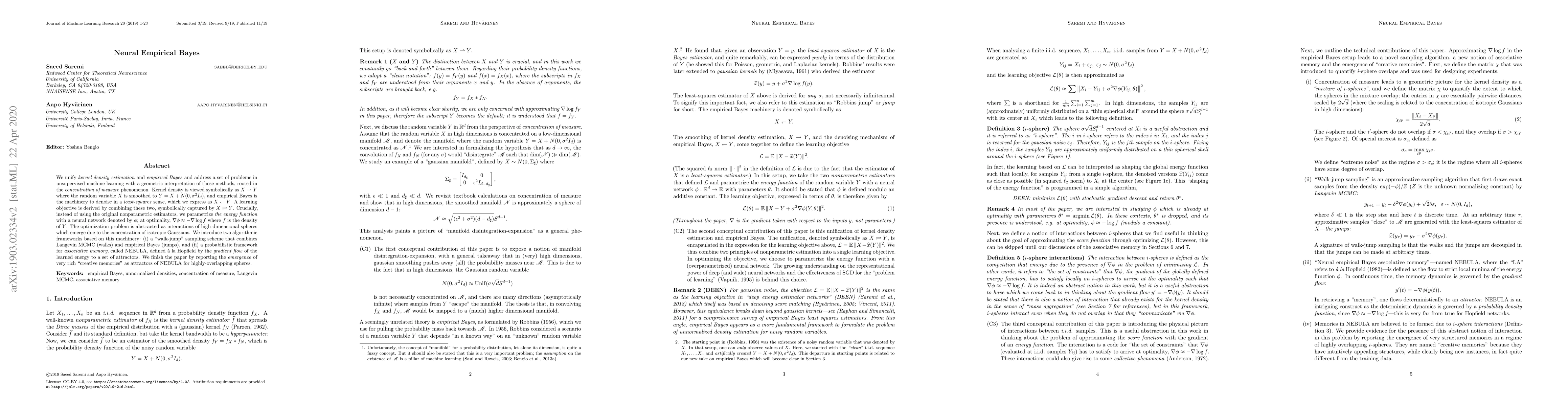 This paper unifies kernel density estimation and empirical Bayes through a neural network-parametrized energy function, leveraging the concentration of measure phenomenon. It introduces two frameworks: a "walk-jump" sampling scheme and NEBULA, a probabilistic associative memory model, showcasing the emergence of "creative memories" as attractors.
