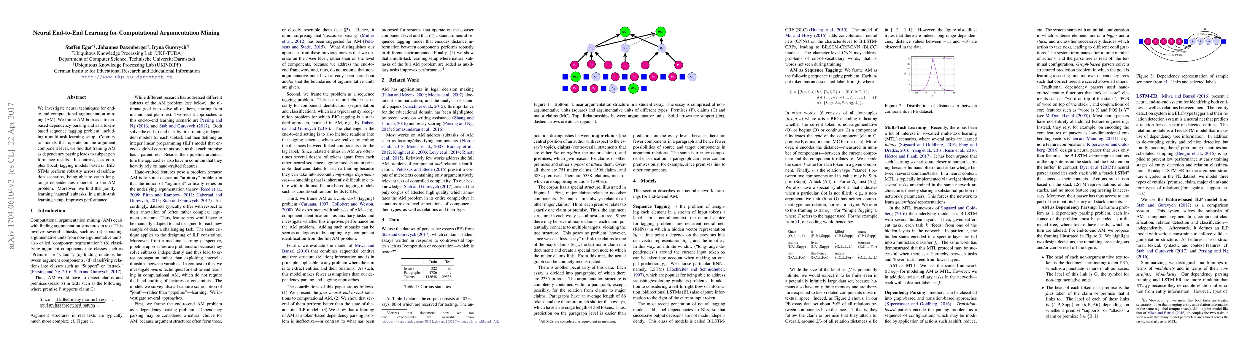 This paper explores neural end-to-end learning for computational argumentation mining, finding that BiLSTM-based local tagging models outperform dependency parsing approaches. The study also demonstrates that multi-task learning enhances performance by jointly learning related subtasks.