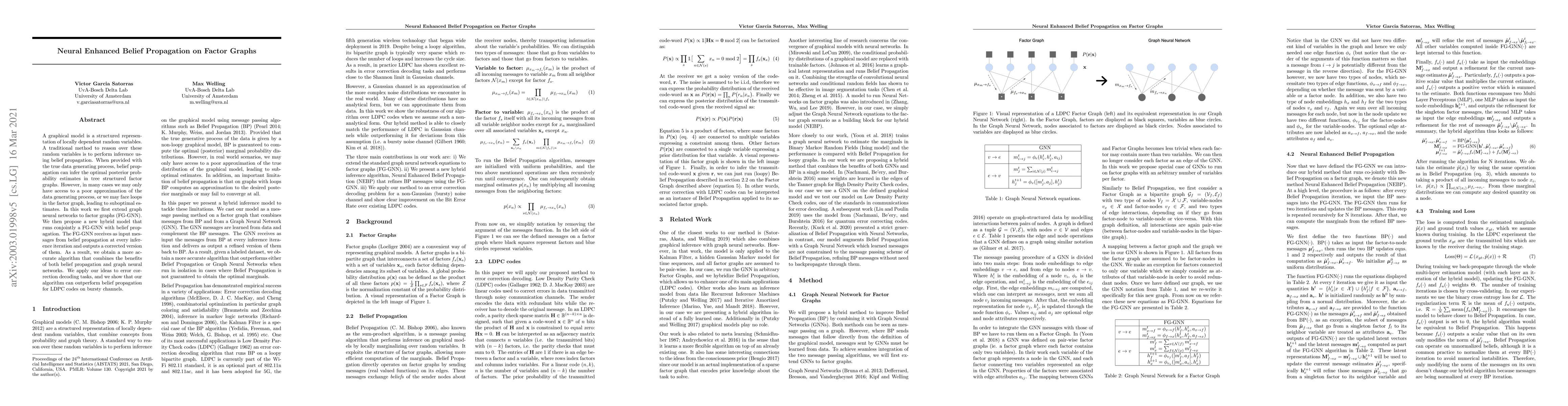 A graphical model is a structured representation of locally dependent random variables. A traditional method to reason over these random variables is to perform inference using belief propagation. When provided with the true data generating process, belief propagation can infer the optimal posterior probability estimates in tree structured factor graphs. However, in many cases we may only have access to a poor approximation of the data generating process, or we may face loops in the factor graph, leading to suboptimal estimates. In this work we first extend graph neural networks to factor graphs (FG-GNN). We then propose a new hybrid model that runs conjointly a FG-GNN with belief propagation. The FG-GNN receives as input messages from belief propagation at every inference iteration and outputs a corrected version of them. As a result, we obtain a more accurate algorithm that combines the benefits of both belief propagation and graph neural networks. We apply our ideas to error correction decoding tasks, and we show that our algorithm can outperform belief propagation for LDPC codes on bursty channels.