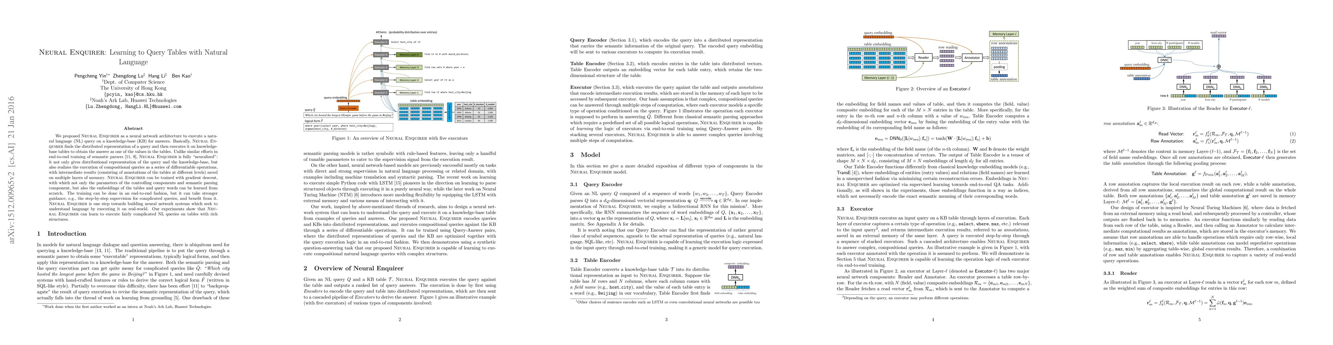 Neural Enquirer is a neural network that can execute natural language queries on tables to get answers. It can learn to process complex queries in an end-to-end manner.