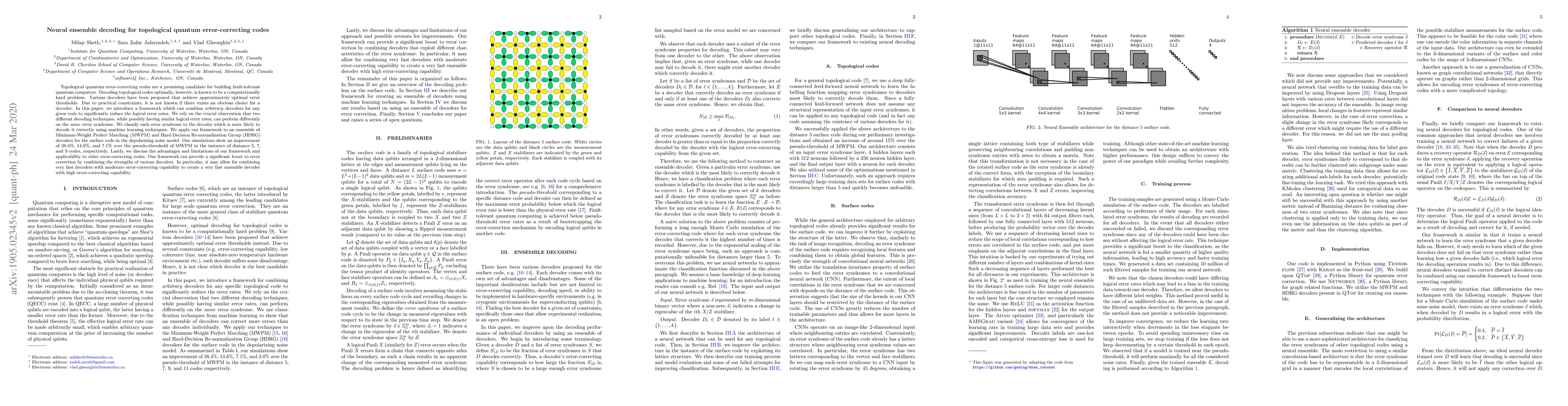 This paper introduces a neural ensemble decoding framework that combines different decoders to reduce logical error rates in topological quantum error-correcting codes. By leveraging machine learning to assign error syndromes to the most effective decoder, the authors demonstrate significant improvements over the Minimum-Weight Perfect Matching decoder for surface codes, achieving up to 38.4% better performance in certain instances.