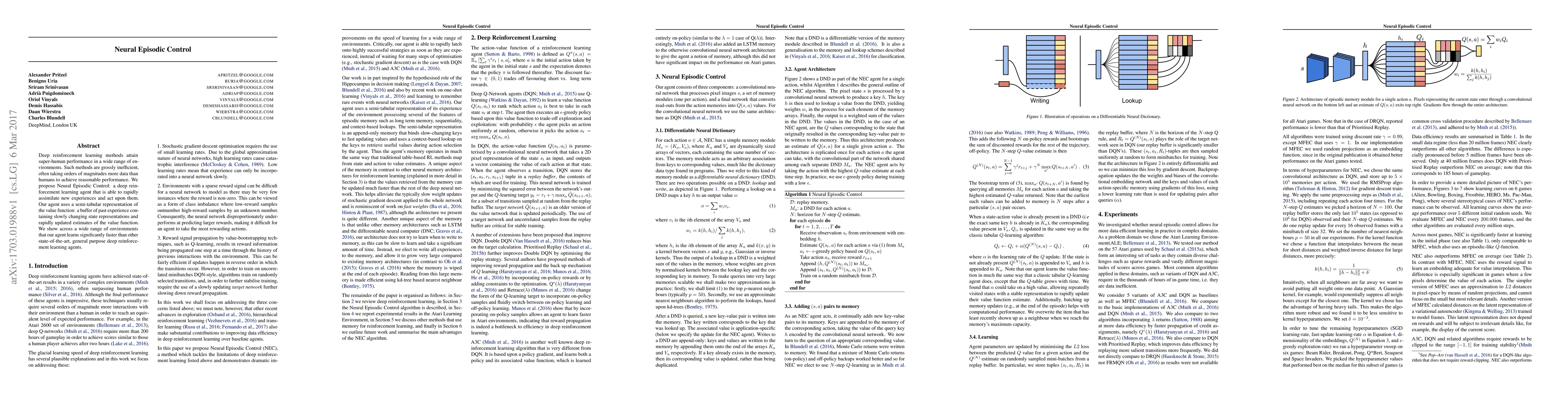 Deep reinforcement learning methods attain super-human performance in a wide range of environments. Such methods are grossly inefficient, often taking orders of magnitudes more data than humans to achieve reasonable performance. We propose Neural Episodic Control: a deep reinforcement learning agent that is able to rapidly assimilate new experiences and act upon them. Our agent uses a semi-tabular representation of the value function: a buffer of past experience containing slowly changing state representations and rapidly updated estimates of the value function. We show across a wide range of environments that our agent learns significantly faster than other state-of-the-art, general purpose deep reinforcement learning agents.