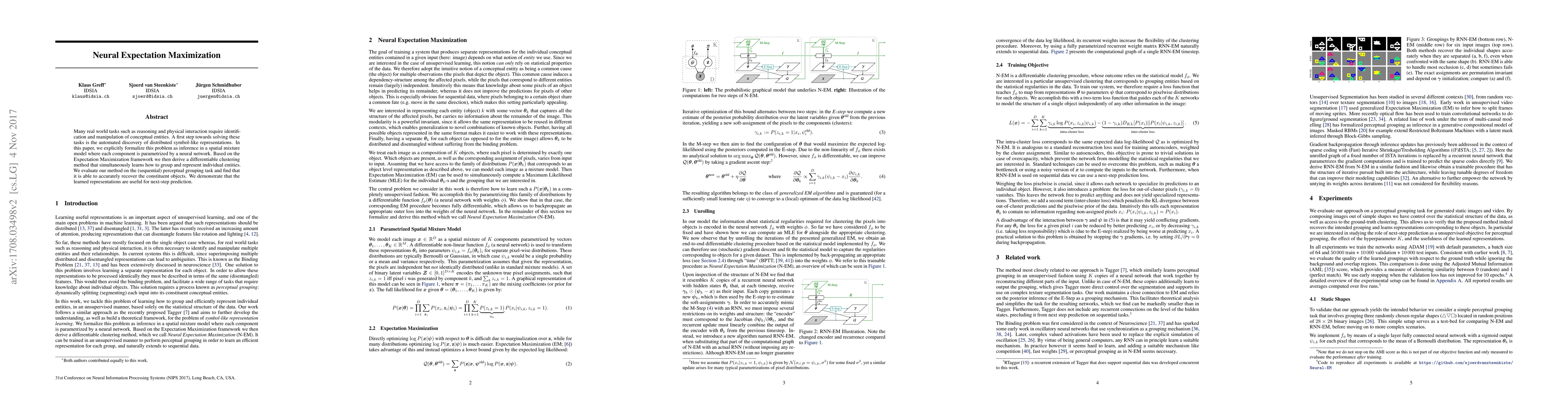 The paper proposes Neural Expectation Maximization (N-EM), a differentiable clustering method that combines neural networks with the Expectation Maximization (EM) framework for discovering distributed symbol-like representations of entities. It derives RNN-EM from N-EM, which is trained to predict the next step, aiding in grouping and representation learning.