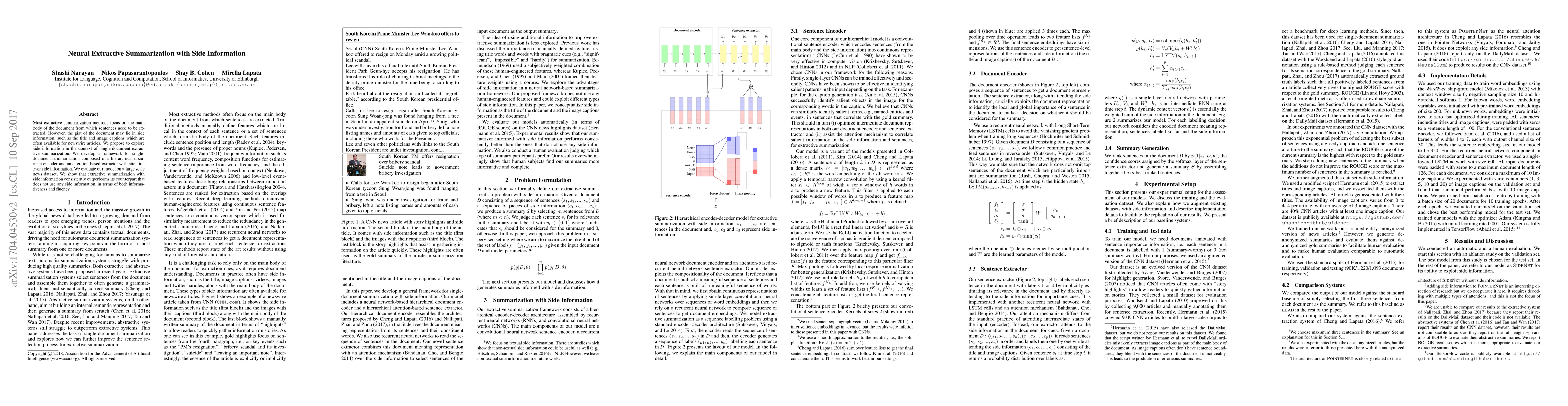 This paper proposes a neural extractive summarization framework that leverages side information, such as titles and image captions, to improve summarization quality for newswire articles. The model outperforms traditional methods by consistently delivering more informative and fluent summaries.
