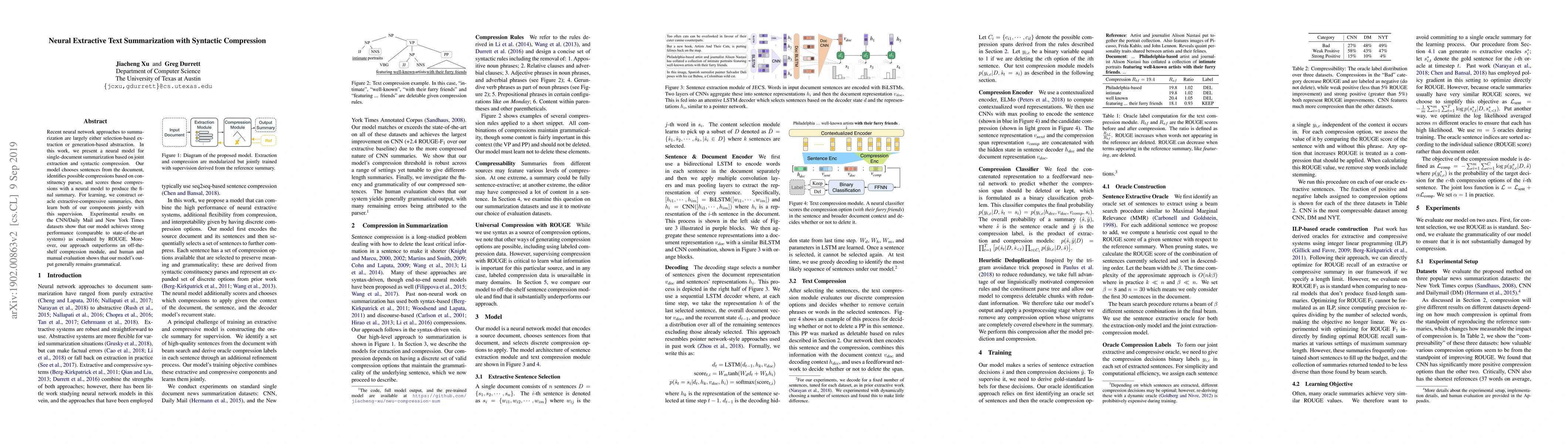 This paper introduces a neural model for single-document summarization that combines sentence extraction with syntactic compression, achieving competitive performance against state-of-the-art systems on standard datasets while maintaining grammaticality in summaries.