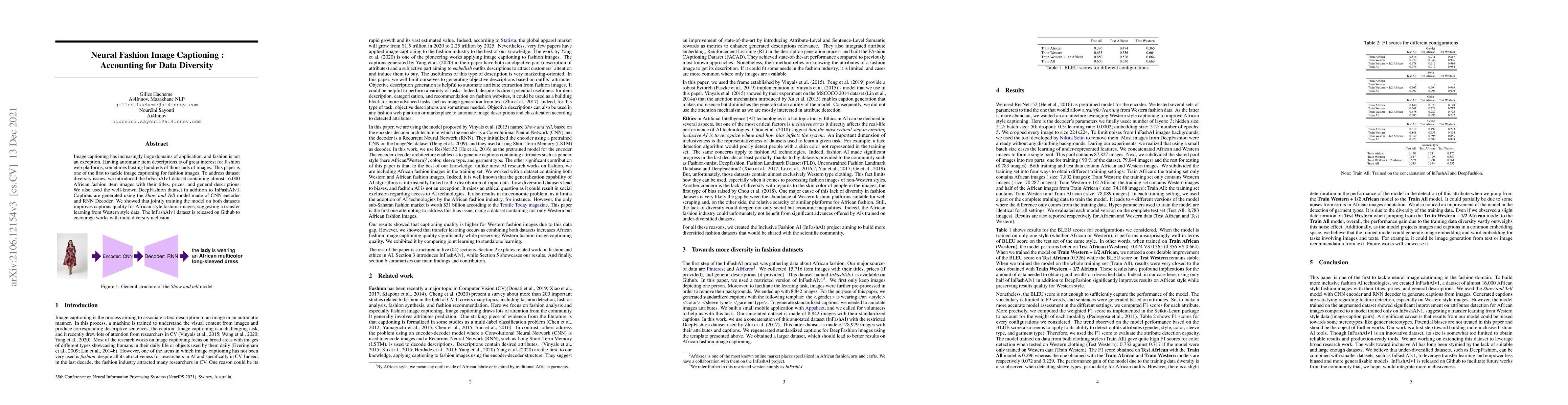 Image captioning has increasingly large domains of application, and fashion is not an exception. Having automatic item descriptions is of great interest for fashion web platforms, sometimes hosting hundreds of thousands of images. This paper is one of the first to tackle image captioning for fashion images. To address dataset diversity issues, we introduced the InFashAIv1 dataset containing almost 16.000 African fashion item images with their titles, prices, and general descriptions. We also used the well-known DeepFashion dataset in addition to InFashAIv1. Captions are generated using the Show and Tell model made of CNN encoder and RNN Decoder. We showed that jointly training the model on both datasets improves captions quality for African style fashion images, suggesting a transfer learning from Western style data. The InFashAIv1 dataset is released on Github to encourage works with more diversity inclusion.