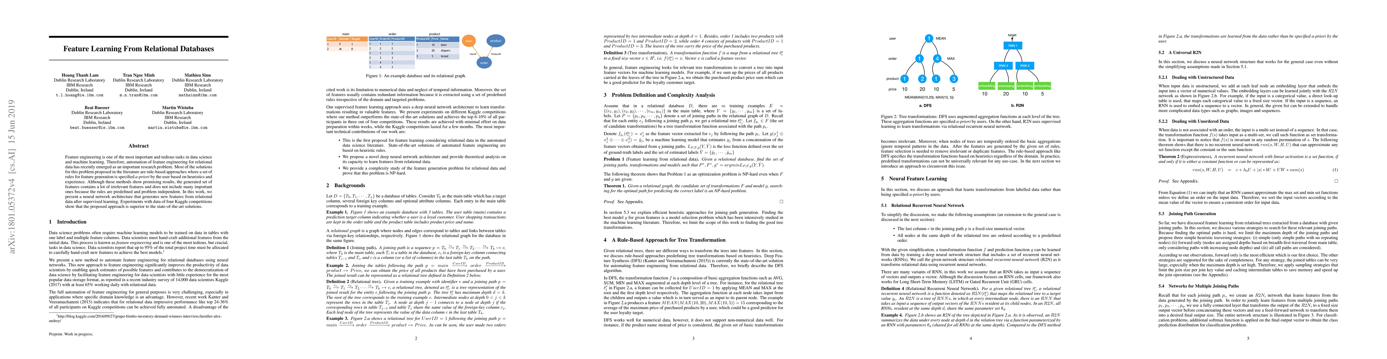 This paper explores automating feature learning from relational databases, proving the task is NP-hard. The authors propose a rule-based heuristic and deep neural network approach, achieving top Kaggle competition results and surpassing state-of-the-art methods.