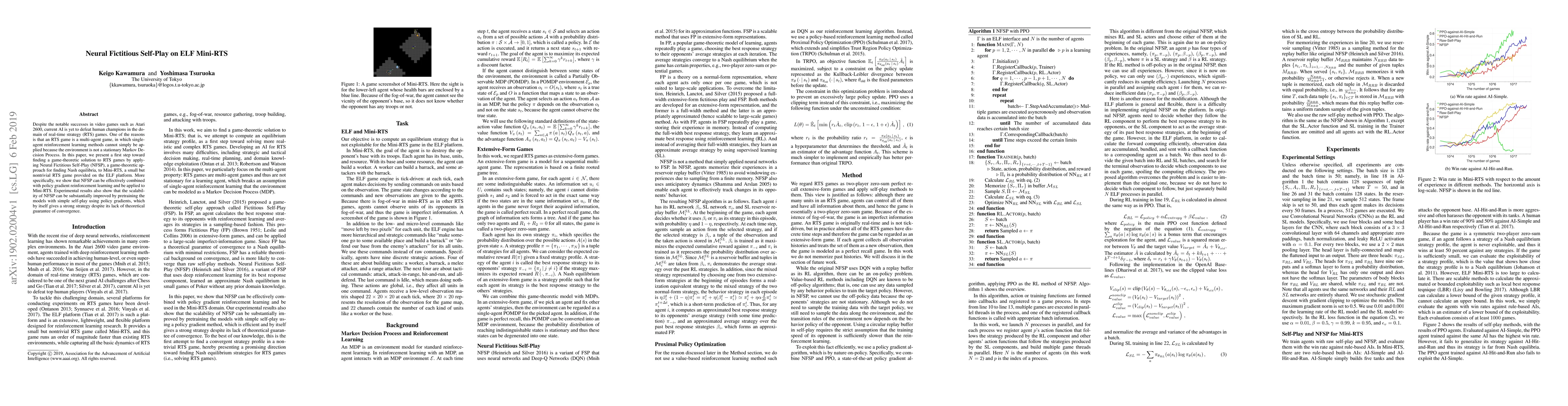 This paper explores Neural Fictitious Self-Play (NFSP) for solving real-time strategy (RTS) games, demonstrating its application to Mini-RTS on the ELF platform. The results show that NFSP combined with policy gradient reinforcement learning can effectively tackle the multi-agent nature of RTS games, with pretraining improving scalability and yielding strong strategies.