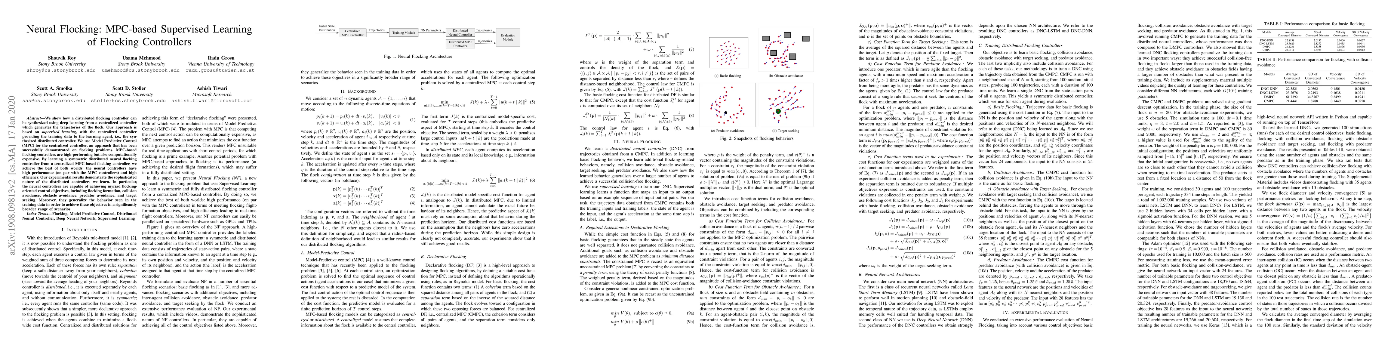 This paper presents a method for synthesizing distributed flocking controllers using supervised learning from a centralized Model Predictive Control (MPC)-based controller. The resulting neural controllers achieve high performance and efficiency, successfully handling various flocking objectives and generalizing beyond training scenarios.