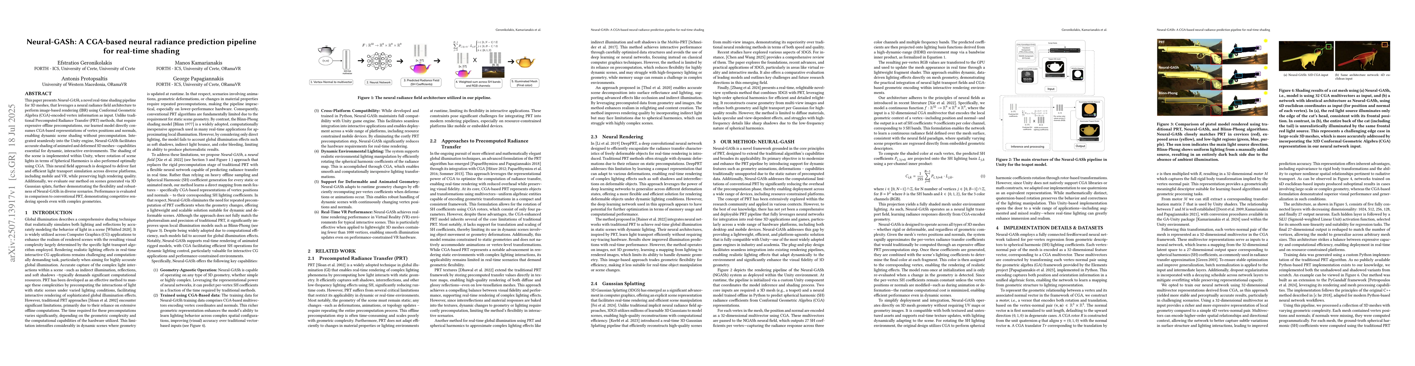 This paper presents Neural-GASh, a novel real-time shading pipeline for 3D meshes, that leverages a neural radiance field architecture to perform image-based rendering (IBR) using Conformal Geometric Algebra (CGA)-encoded vertex information as input. Unlike traditional Precomputed Radiance Transfer (PRT) methods, that require expensive offline precomputations, our learned model directly consumes CGA-based representations of vertex positions and normals, enabling dynamic scene shading without precomputation. Integrated seamlessly into the Unity engine, Neural-GASh facilitates accurate shading of animated and deformed 3D meshes - capabilities essential for dynamic, interactive environments. The shading of the scene is implemented within Unity, where rotation of scene lights in terms of Spherical Harmonics is also performed optimally using CGA. This neural field approach is designed to deliver fast and efficient light transport simulation across diverse platforms, including mobile and VR, while preserving high rendering quality. Additionally, we evaluate our method on scenes generated via 3D Gaussian splats, further demonstrating the flexibility and robustness of Neural-GASh in diverse scenarios. Performance is evaluated in comparison to conventional PRT, demonstrating competitive rendering speeds even with complex geometries.