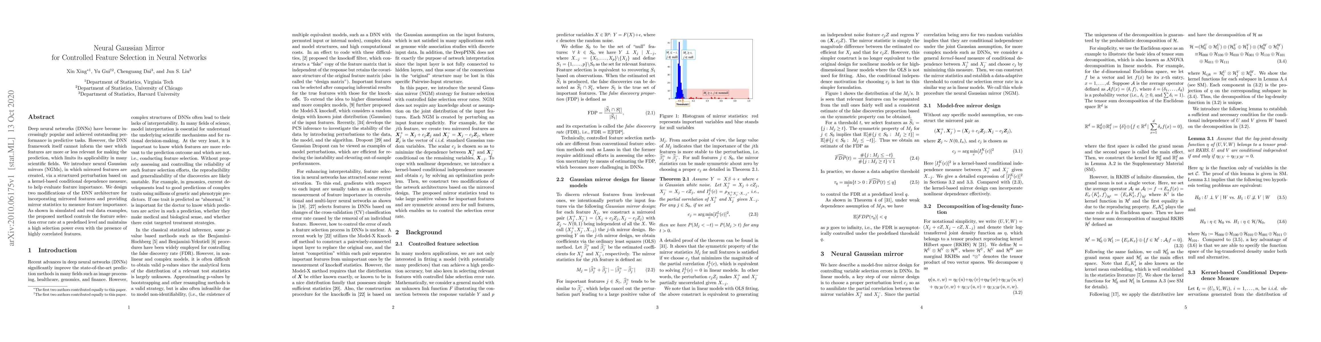 The paper introduces neural Gaussian mirrors (NGMs) to evaluate feature importance in deep neural networks, creating mirrored features via structured perturbations. The proposed method modifies DNN architecture to incorporate these features, controlling feature selection error rates while maintaining high selection power, especially with correlated features.
