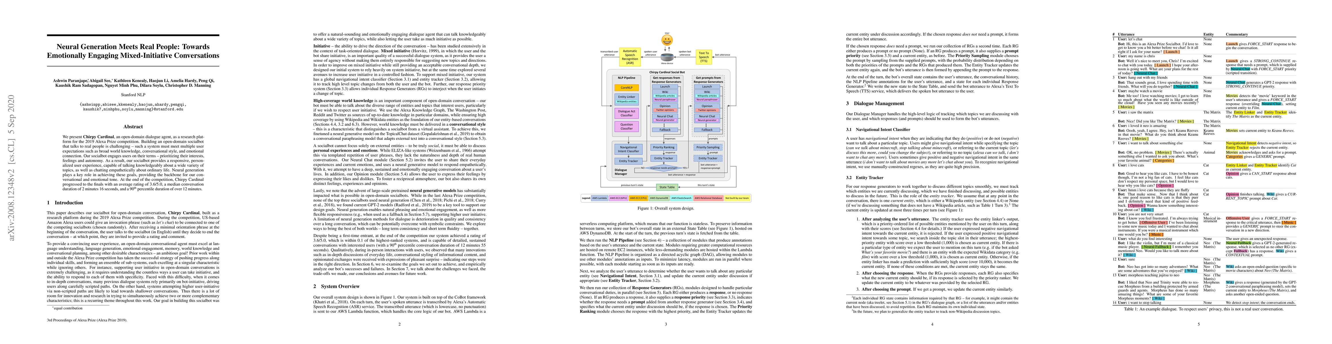 We present Chirpy Cardinal, an open-domain dialogue agent, as a research platform for the 2019 Alexa Prize competition. Building an open-domain socialbot that talks to real people is challenging - such a system must meet multiple user expectations such as broad world knowledge, conversational style, and emotional connection. Our socialbot engages users on their terms - prioritizing their interests, feelings and autonomy. As a result, our socialbot provides a responsive, personalized user experience, capable of talking knowledgeably about a wide variety of topics, as well as chatting empathetically about ordinary life. Neural generation plays a key role in achieving these goals, providing the backbone for our conversational and emotional tone. At the end of the competition, Chirpy Cardinal progressed to the finals with an average rating of 3.6/5.0, a median conversation duration of 2 minutes 16 seconds, and a 90th percentile duration of over 12 minutes.