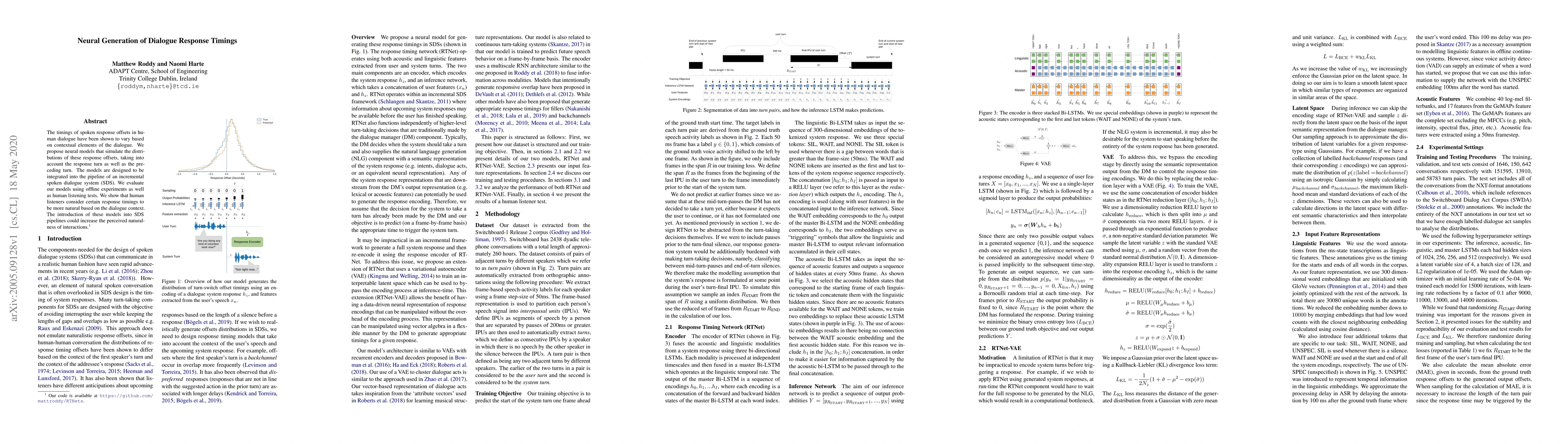 The paper proposes neural models that simulate the distributions of spoken response offsets in dialogue, considering the response turn and preceding turn. These models are designed for integration into an incremental spoken dialogue system (SDS) pipeline and are evaluated using offline experiments and human listening tests.