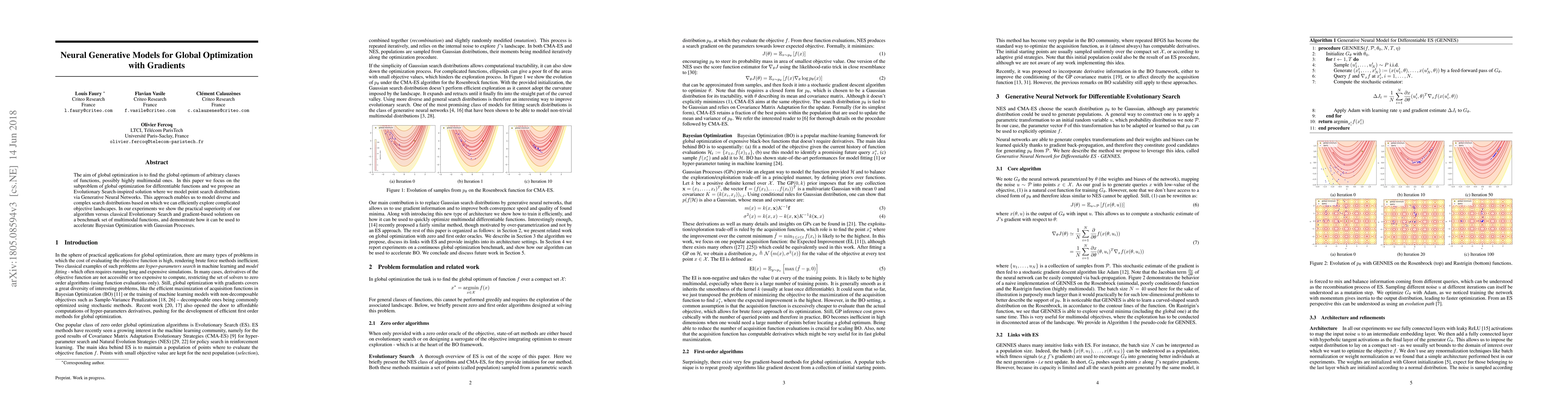 The aim of global optimization is to find the global optimum of arbitrary classes of functions, possibly highly multimodal ones. In this paper we focus on the subproblem of global optimization for differentiable functions and we propose an Evolutionary Search-inspired solution where we model point search distributions via Generative Neural Networks. This approach enables us to model diverse and complex search distributions based on which we can efficiently explore complicated objective landscapes. In our experiments we show the practical superiority of our algorithm versus classical Evolutionary Search and gradient-based solutions on a benchmark set of multimodal functions, and demonstrate how it can be used to accelerate Bayesian Optimization with Gaussian Processes.