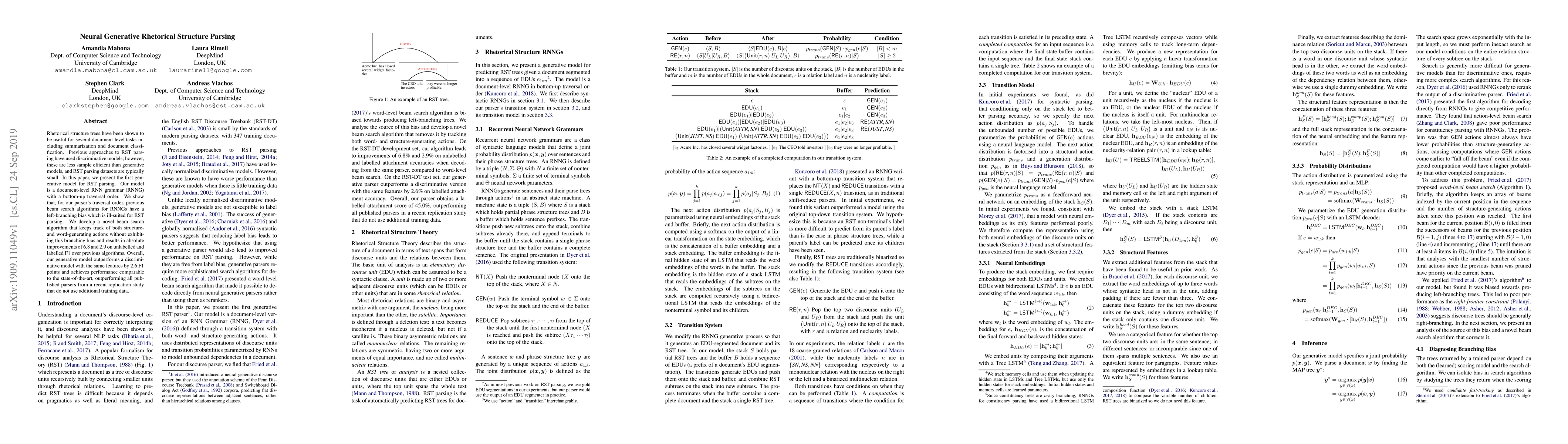 This paper introduces a generative model for parsing Rhetorical Structure Trees (RST) using a document-level RNN grammar with a bottom-up traversal. It proposes a novel beam search algorithm that addresses left-branching bias, achieving significant improvements over previous methods and outperforming discriminative models.