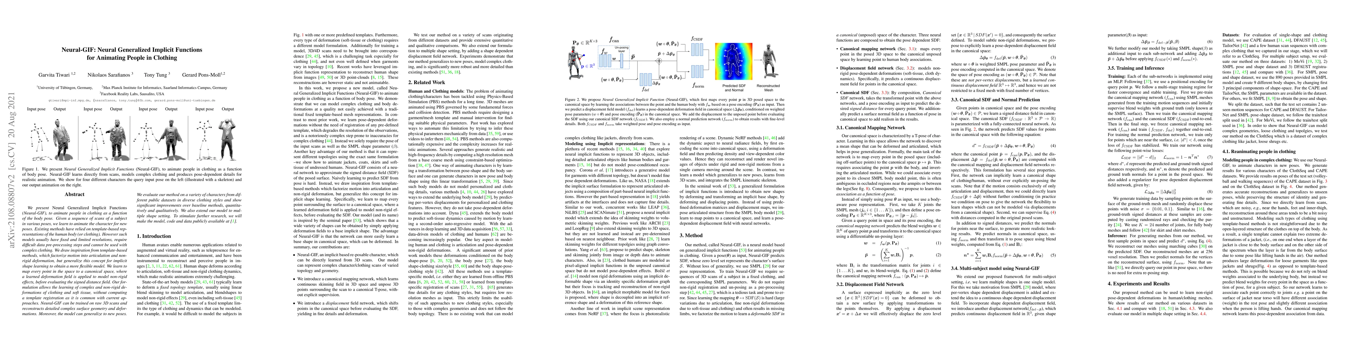 We present Neural Generalized Implicit Functions(Neural-GIF), to animate people in clothing as a function of the body pose. Given a sequence of scans of a subject in various poses, we learn to animate the character for new poses. Existing methods have relied on template-based representations of the human body (or clothing). However such models usually have fixed and limited resolutions, require difficult data pre-processing steps and cannot be used with complex clothing. We draw inspiration from template-based methods, which factorize motion into articulation and non-rigid deformation, but generalize this concept for implicit shape learning to obtain a more flexible model. We learn to map every point in the space to a canonical space, where a learned deformation field is applied to model non-rigid effects, before evaluating the signed distance field. Our formulation allows the learning of complex and non-rigid deformations of clothing and soft tissue, without computing a template registration as it is common with current approaches. Neural-GIF can be trained on raw 3D scans and reconstructs detailed complex surface geometry and deformations. Moreover, the model can generalize to new poses. We evaluate our method on a variety of characters from different public datasets in diverse clothing styles and show significant improvements over baseline methods, quantitatively and qualitatively. We also extend our model to multiple shape setting. To stimulate further research, we will make the model, code and data publicly available at: https://virtualhumans.mpi-inf.mpg.de/neuralgif/