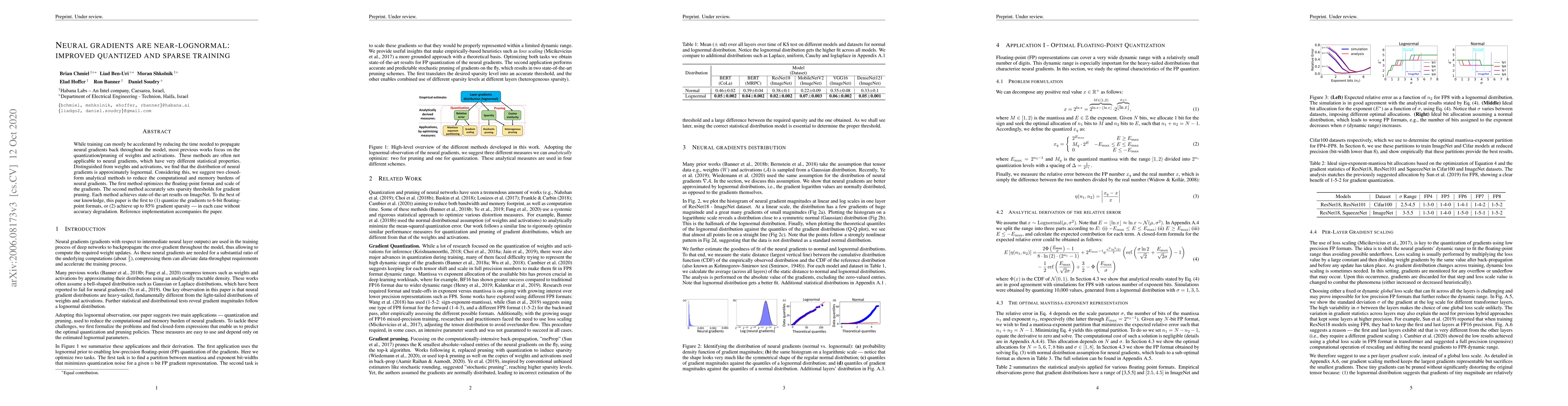 While training can mostly be accelerated by reducing the time needed to propagate neural gradients back throughout the model, most previous works focus on the quantization/pruning of weights and activations. These methods are often not applicable to neural gradients, which have very different statistical properties. Distinguished from weights and activations, we find that the distribution of neural gradients is approximately lognormal. Considering this, we suggest two closed-form analytical methods to reduce the computational and memory burdens of neural gradients. The first method optimizes the floating-point format and scale of the gradients. The second method accurately sets sparsity thresholds for gradient pruning. Each method achieves state-of-the-art results on ImageNet. To the best of our knowledge, this paper is the first to (1) quantize the gradients to 6-bit floating-point formats, or (2) achieve up to 85% gradient sparsity -- in each case without accuracy degradation. Reference implementation accompanies the paper.