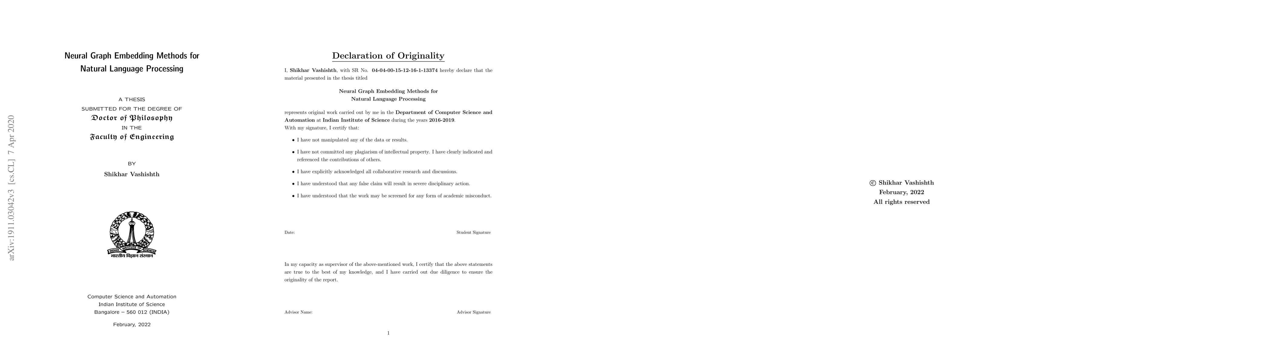 Knowledge graphs are structured representations of facts in a graph, where nodes represent entities and edges represent relationships between them. Recent research has resulted in the development of several large KGs. However, all of them tend to be sparse with very few facts per entity. In the first part of the thesis, we propose two solutions to alleviate this problem: (1) KG Canonicalization, i.e., identifying and merging duplicate entities in a KG, (2) Relation Extraction which involves automating the process of extracting semantic relationships between entities from unstructured text. Traditional Neural Networks like CNNs and RNNs are constrained to handle Euclidean data. However, graphs in Natural Language Processing (NLP) are prominent. Recently, Graph Convolutional Networks (GCNs) have been proposed to address this shortcoming and have been successfully applied for several problems. In the second part of the thesis, we utilize GCNs for Document Timestamping problem and for learning word embeddings using dependency context of a word instead of sequential context. In this third part of the thesis, we address two limitations of existing GCN models, i.e., (1) The standard neighborhood aggregation scheme puts no constraints on the number of nodes that can influence the representation of a target node. This leads to a noisy representation of hub-nodes which coves almost the entire graph in a few hops. (2) Most of the existing GCN models are limited to handle undirected graphs. However, a more general and pervasive class of graphs are relational graphs where each edge has a label and direction associated with it. Existing approaches to handle such graphs suffer from over-parameterization and are restricted to learning representation of nodes only.