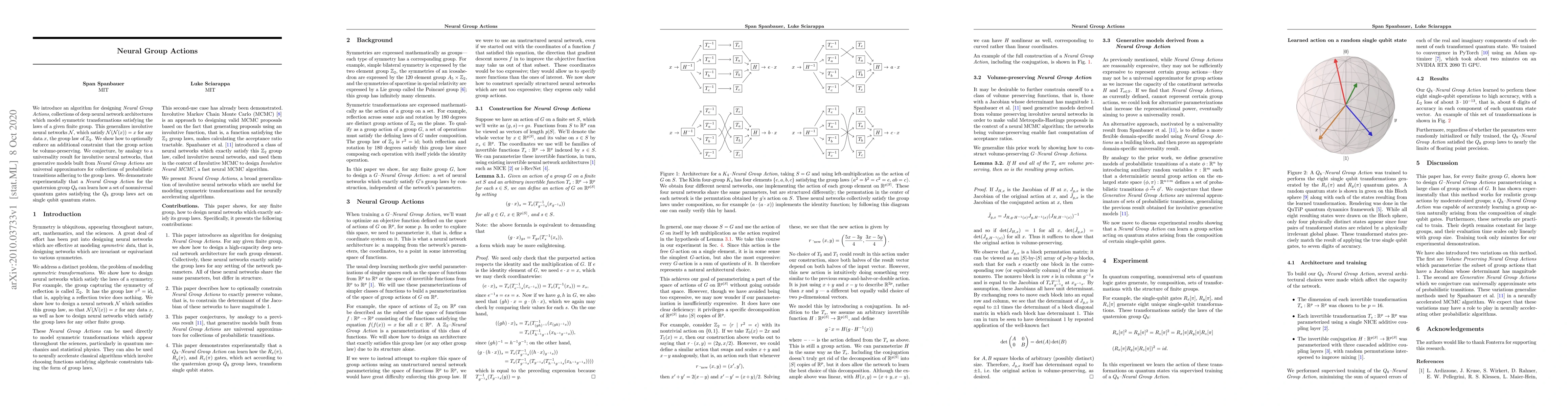 Researchers introduce Neural Group Actions, a new type of neural network that models symmetric transformations and can learn to represent nonuniversal quantum gates. They demonstrate the model's ability to approximate probabilistic transitions adhering to group laws in experiments with a quaternion group.