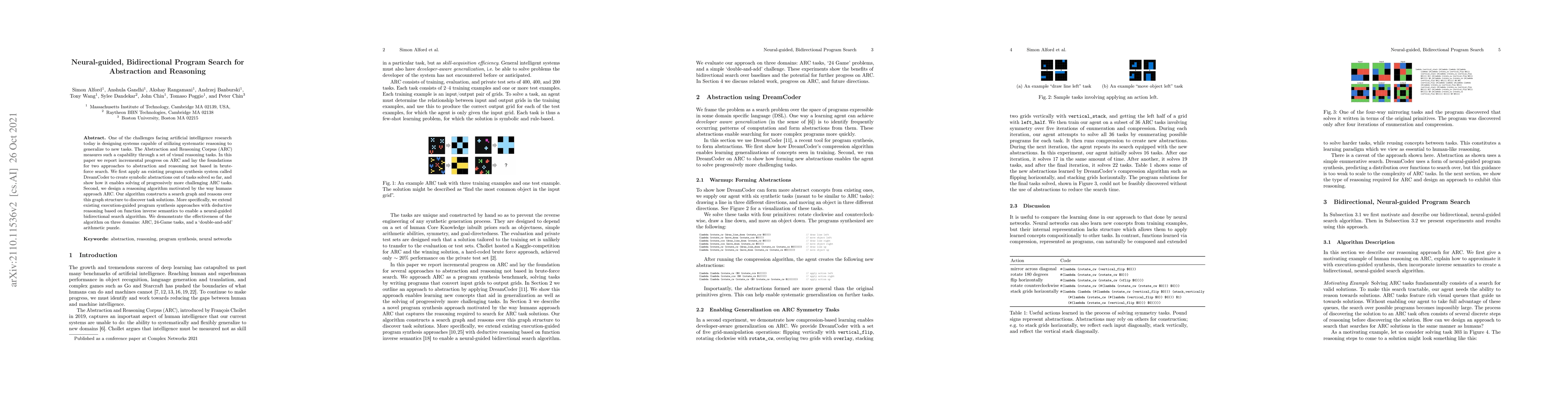 This paper introduces a neural-guided bidirectional program search method to improve abstraction and reasoning for visual tasks, enhancing a program synthesis system to solve progressively difficult problems on the Abstraction and Reasoning Corpus (ARC). The approach combines deductive reasoning with a search graph to discover solutions, demonstrating effectiveness across ARC, 24-Game tasks, and a 'double-and-add' arithmetic puzzle.