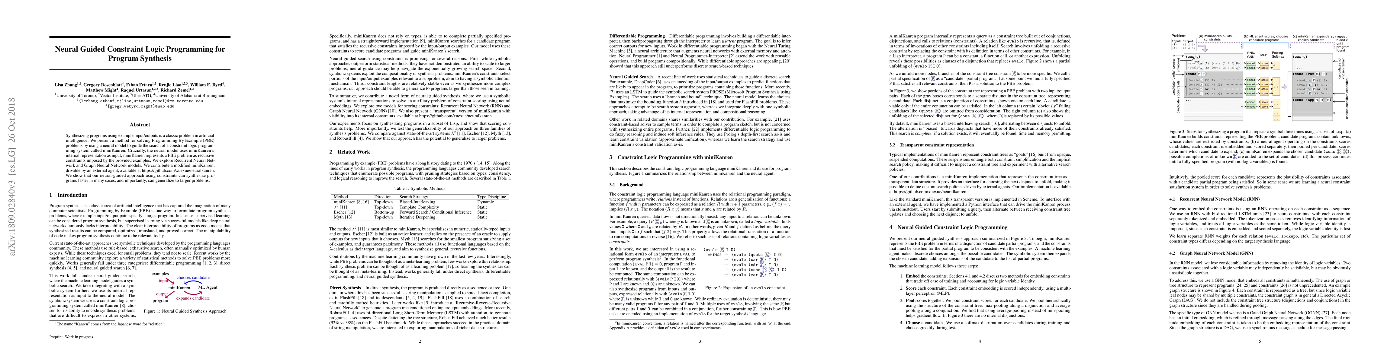 This paper proposes a method for program synthesis using Programming By Example (PBE) that combines a neural model with constraint logic programming via miniKanren. The neural model guides miniKanren's search using its internal representation, and experiments show that this approach can synthesize programs faster and generalize better than traditional methods.