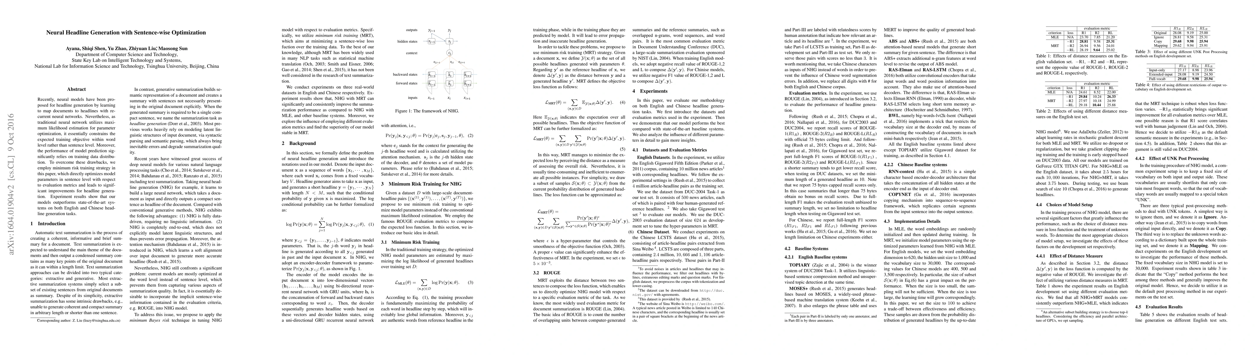 This paper proposes a neural headline generation model that uses minimum risk training to optimize parameters at the sentence level, improving headline generation performance over traditional maximum likelihood estimation. Experimental results demonstrate superior performance compared to state-of-the-art systems in both English and Chinese headline generation tasks.