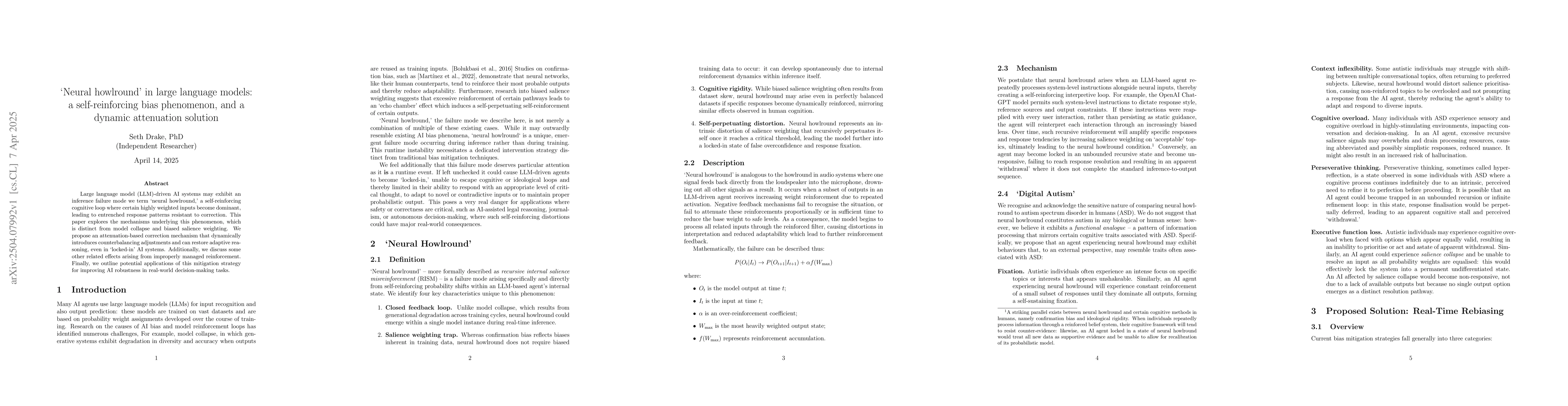 The paper explores 'neural howlround,' a self-reinforcing bias phenomenon in large language models through theoretical analysis and proposes a dynamic attenuation solution.