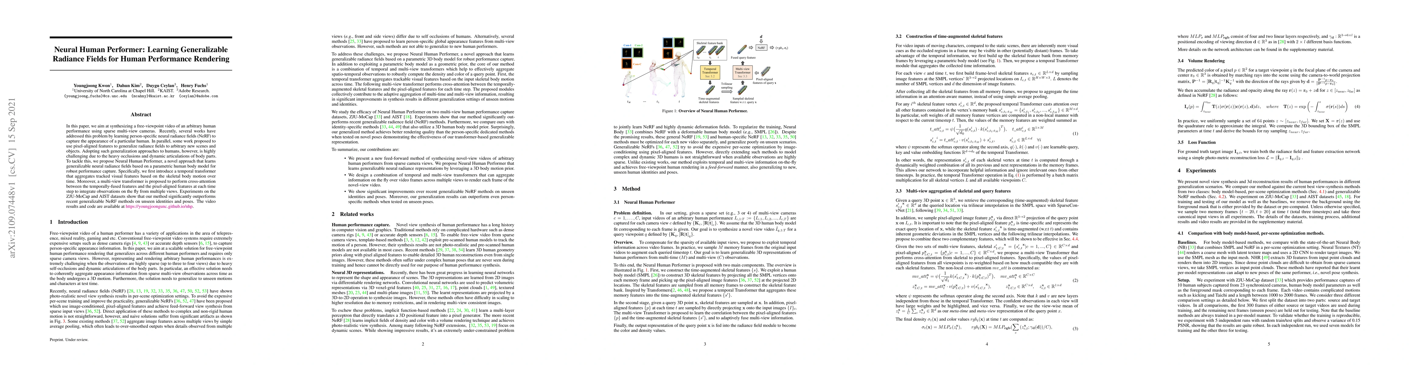 This paper introduces Neural Human Performer, a method to synthesize free-viewpoint videos of human performances using sparse multi-view cameras. It leverages a parametric human body model and a multi-view transformer to create generalizable neural radiance fields, outperforming recent methods on unseen identities and poses.