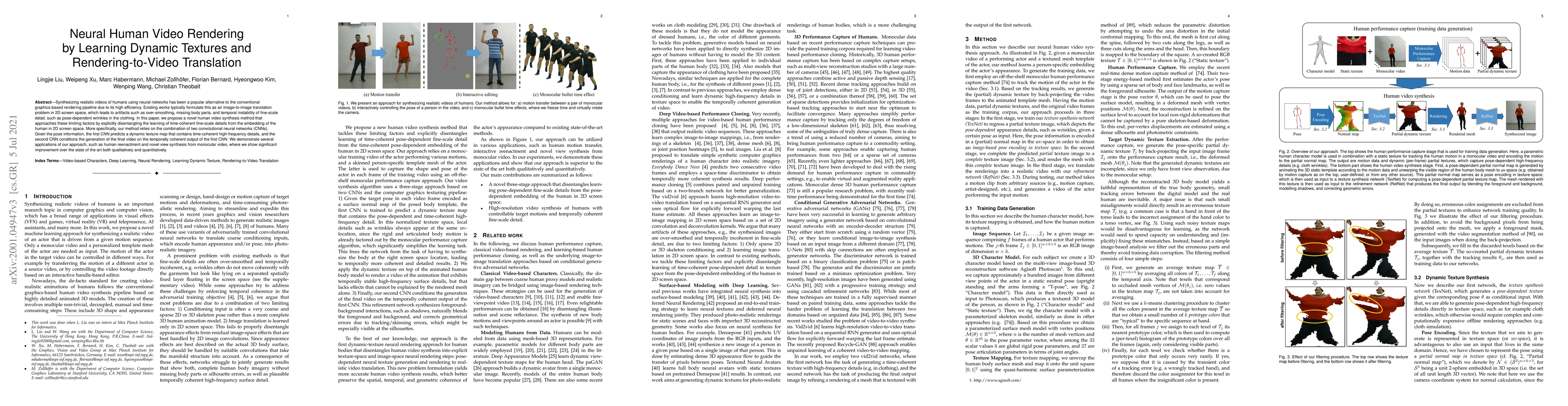 This paper proposes a new neural network method to synthesize realistic human videos by disentangling the learning of time-coherent fine-scale details from 2D screen space embedding, using two CNNs to predict dynamic textures and translate them to video, showing improvements in applications like human reenactment and novel view synthesis.