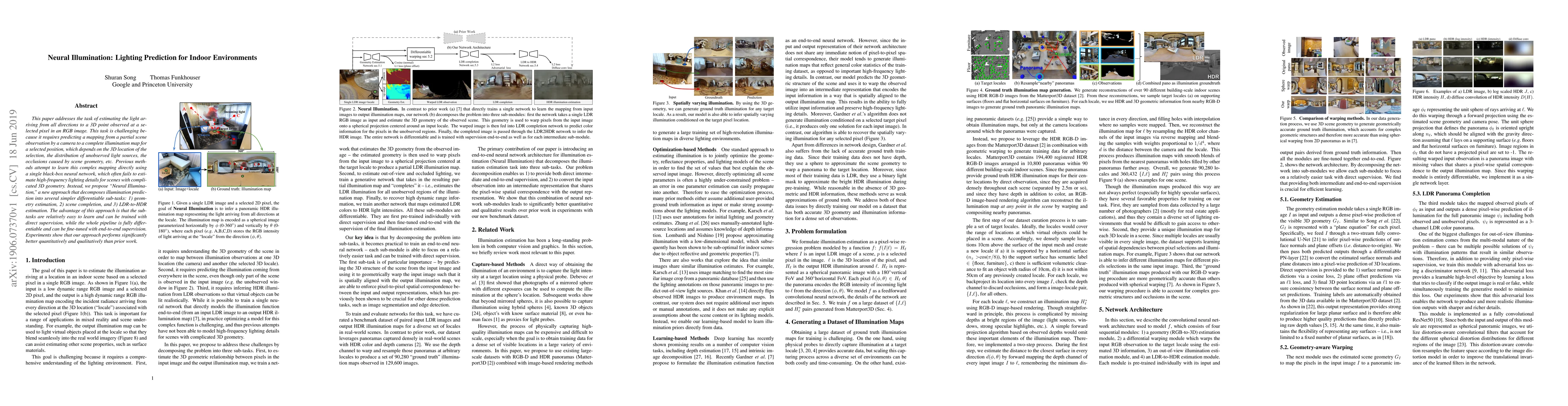 This paper introduces "Neural Illumination," a method that decomposes indoor lighting prediction into simpler sub-tasks: geometry estimation, scene completion, and LDR-to-HDR estimation, achieving better performance than previous black-box neural network approaches. The proposed method is trained with direct supervision and fine-tuned end-to-end.
