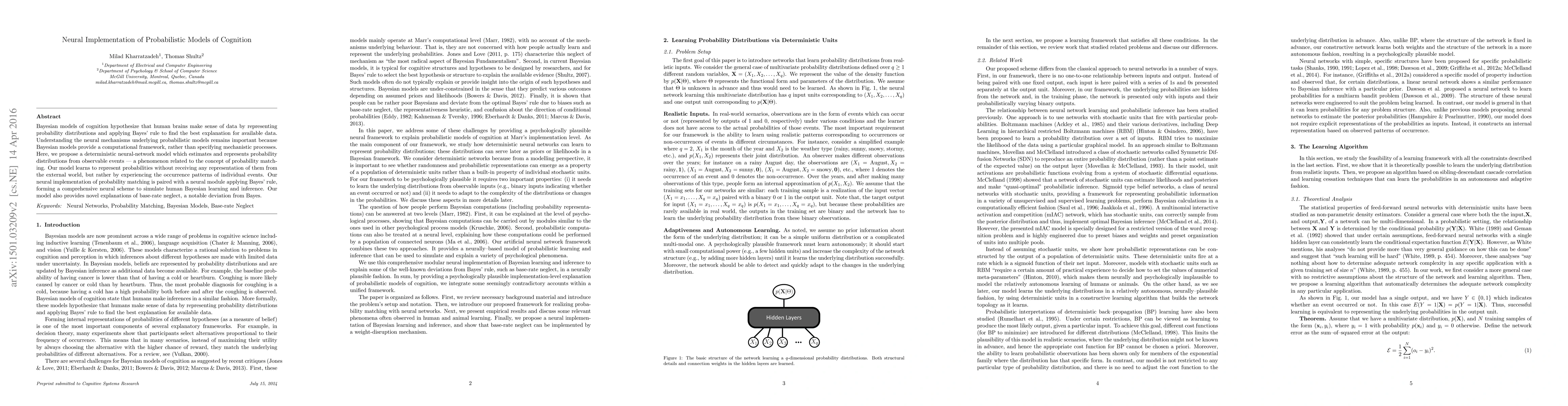 Bayesian models of cognition hypothesize that human brains make sense of data by representing probability distributions and applying Bayes' rule to find the best explanation for available data. Understanding the neural mechanisms underlying probabilistic models remains important because Bayesian models provide a computational framework, rather than specifying mechanistic processes. Here, we propose a deterministic neural-network model which estimates and represents probability distributions from observable events --- a phenomenon related to the concept of probability matching. Our model learns to represent probabilities without receiving any representation of them from the external world, but rather by experiencing the occurrence patterns of individual events. Our neural implementation of probability matching is paired with a neural module applying Bayes' rule, forming a comprehensive neural scheme to simulate human Bayesian learning and inference. Our model also provides novel explanations of base-rate neglect, a notable deviation from Bayes.