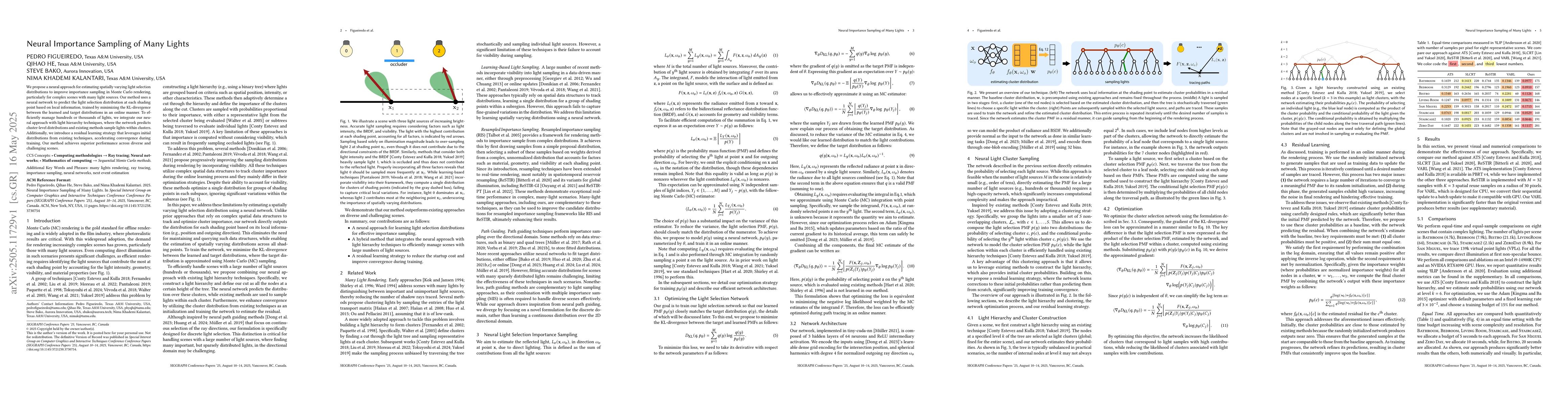 This work is novel by merging neural networks with importance sampling in Monte Carlo rendering, specifically tailored for scenes with many light sources, and by introducing a residual learning strategy to accelerate convergence.