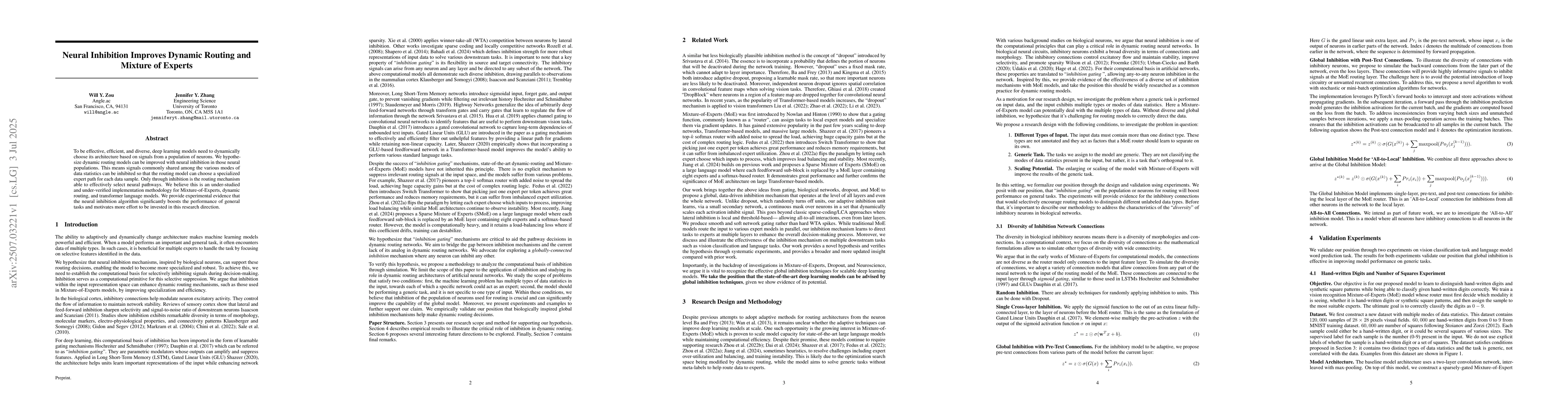 To be effective, efficient, and diverse, deep learning models need to dynamically choose its architecture based on signals from a population of neurons. We hypothesize dynamic routing models can be improved with neural inhibition in those neural populations. This means signals commonly shared among the various modes of data statistics can be inhibited so that the routing model can choose a specialized expert path for each data sample. Only through inhibition is the routing mechanism able to effectively select neural pathways. We believe this is an under-studied and under-verified implementation methodology for Mixture-of-Experts, dynamic routing, and transformer language models. We provide experimental evidence that the neural inhibition algorithm significantly boosts the performance of general tasks and motivates more effort to be invested in this research direction.